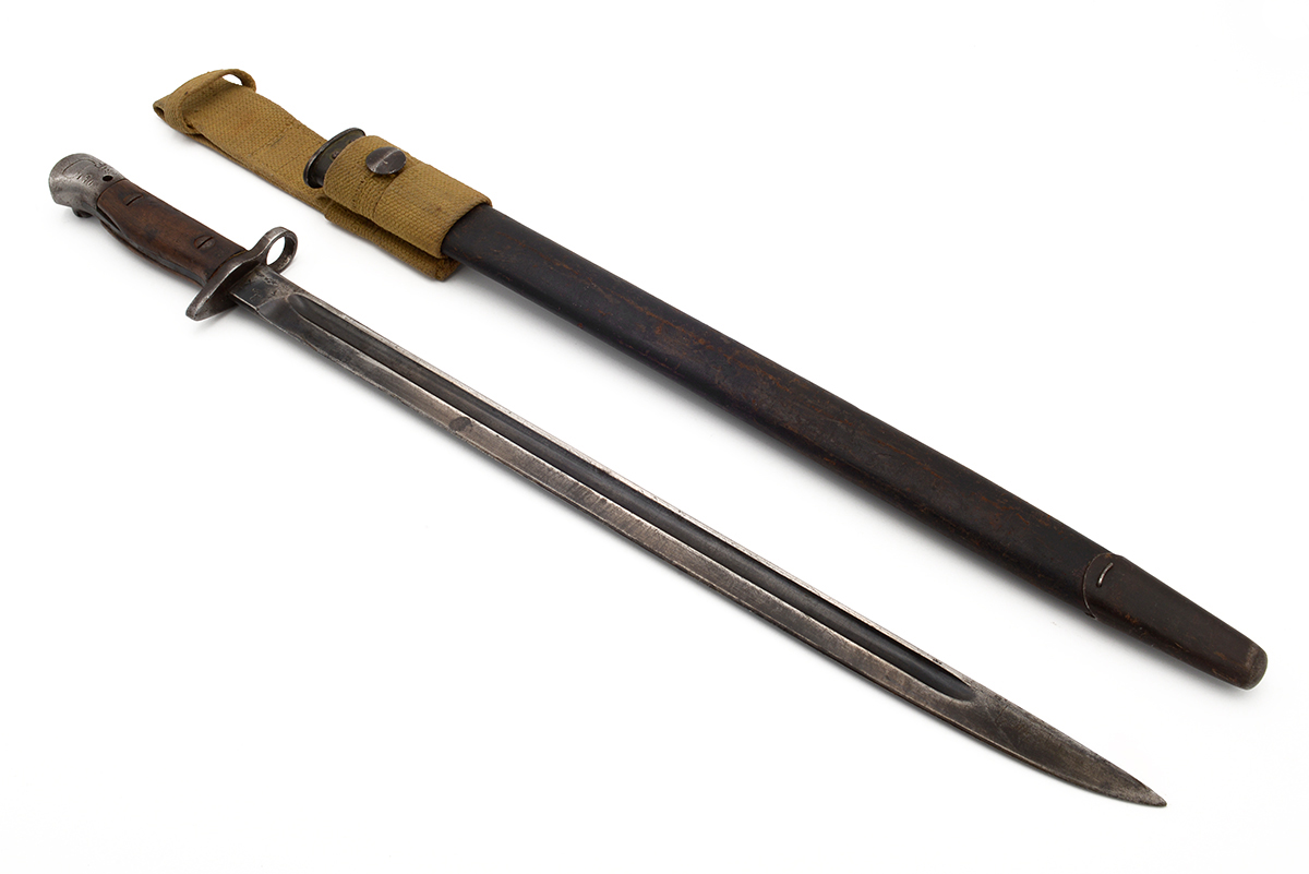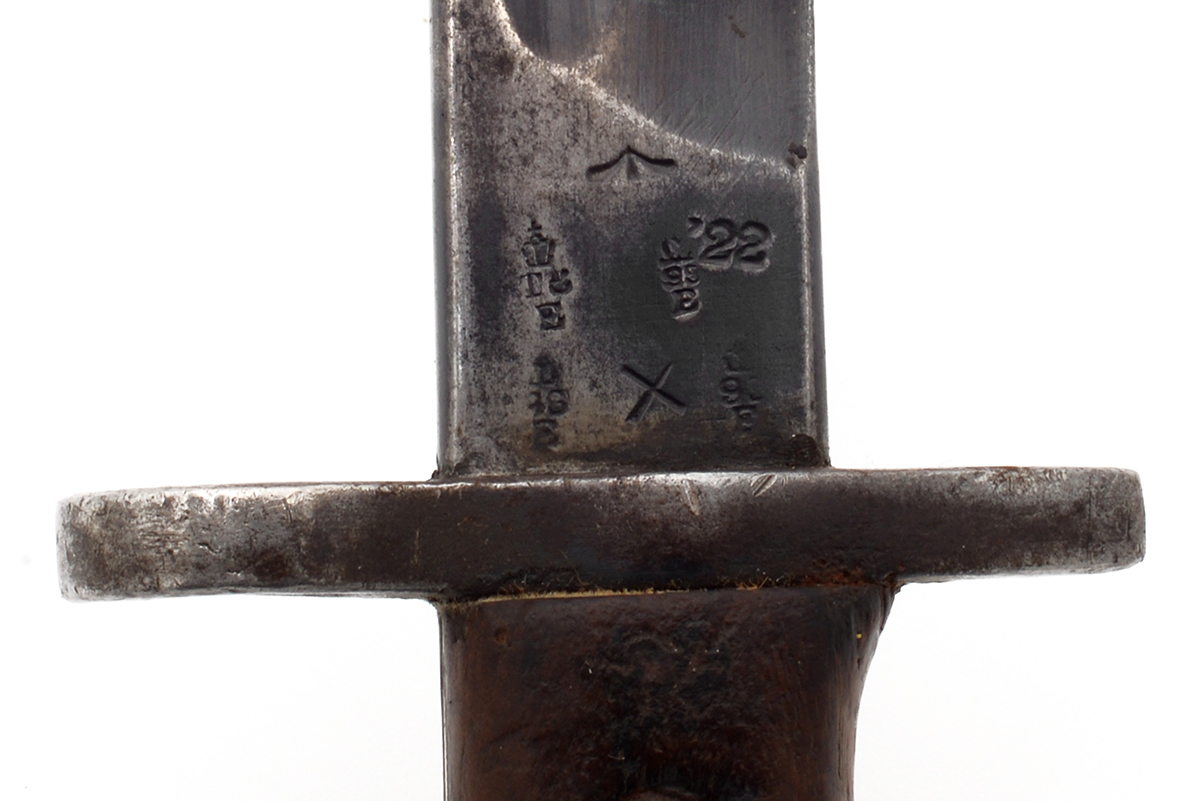 This is a rare WW1 era British Pattern 1907 bayonet by Chapman for use with SMLE rifle. It features a 16.75" blade with an overall length of 21.75", the ricasso is faintly marked "18" indicating 1918 manufacture. James A. Chapman produced only about 300,000 Pattern 1907 bayonets out of the approximately 5 million made during WW1. This example more than likely saw service by the British Empire during WW1, WW2 or both but the markings on the pommel also indicate that it probably ended up going to India after WW2 as many of these bayonets did. If only this bayonet could talk! Overall condition is good with typical surplus wear, the semi-sharp edge appears to be original and much of the bluing still remains on the blade. The leather scabbard is in nice shape with some scuffs and scratches. Buy online today!