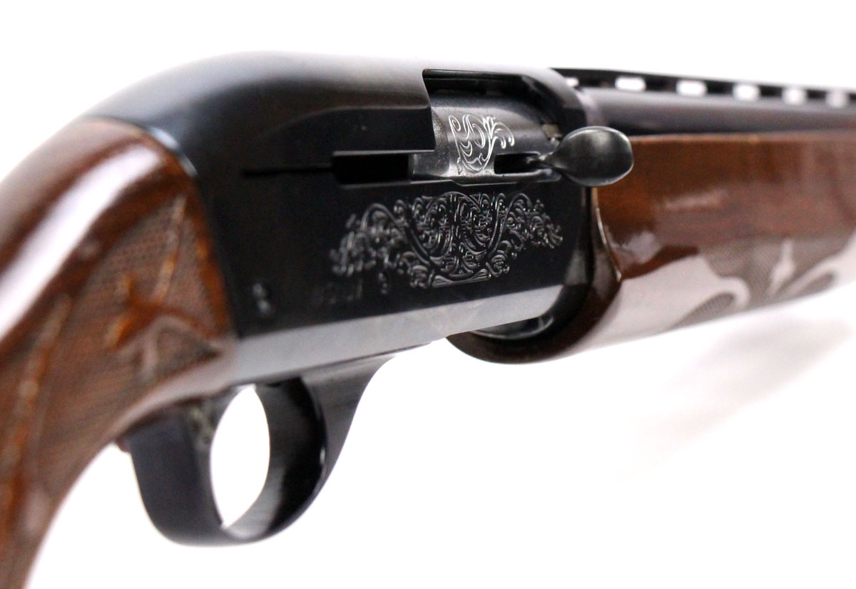 This is a used Remington 1100 Magnum shotgun chambered in 12 gauge. It features a 30-inch vent rib barrel, 3-inch chamber (3-inch shells only), 14-inch length of pull, fixed full choke, cross-bolt safety, blued finish, and wood furniture. Overall, this Remington is in good condition with handling wear on the stock. This would be a good choice for hunting. Buy online today!