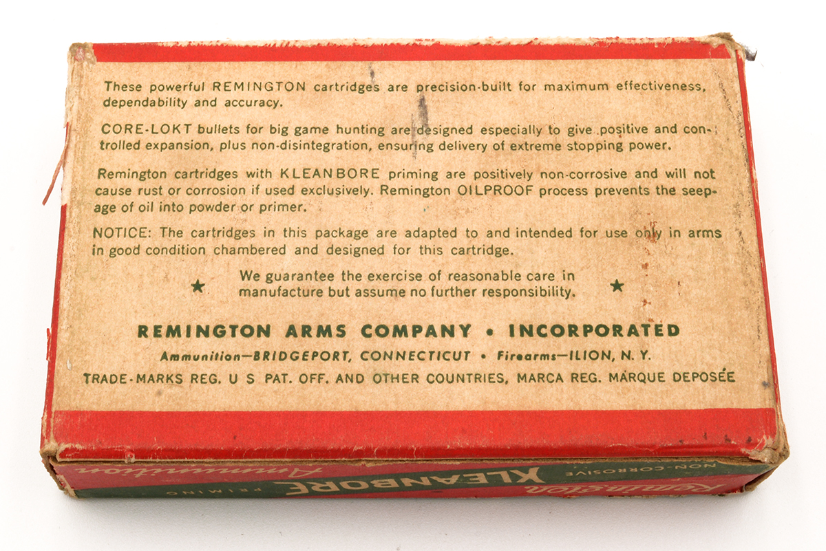 This is a box of vintage Remington Kleanbore .30-06 Springfield Hi-Speed ammo. It features 19 rounds of 180 grain pointed soft point Core-Lokt bullets with brass cases. Overall condition of the ammo is good with some minor tarnishing to the brass, the box has some wear, creases, scuffs and soft edges but is intact. This would be a good item for anyone who collects vintage ammo and boxes. Buy online today!