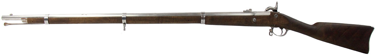 This is a used Reproduction Springfield 1861 Musket chambered for 58 caliber projectiles. It features a 40-inch rifled barrel, percussion ignition system, steel ramrod, flip-up leaf sights, and sling swivels. Overall, this musket is in good condition with some surface corrosion on the barrel, lock, and front barrel band. Bore condition is fair with corrosion throughout the rifling. This would be a good choice for historical reenactors. Buy online today!
