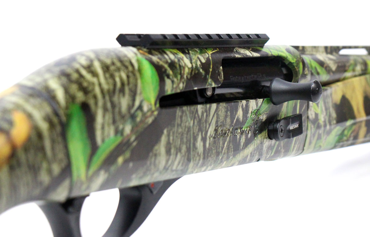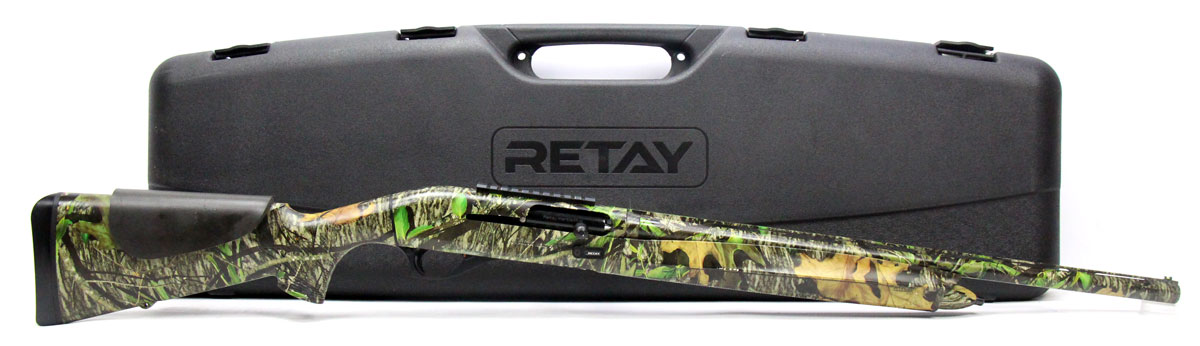 This is a used Retay Masai Mara Turkey shotgun chambered in 20 gauge. It features a 22-inch vent rib barrel, 3-inch chamber, 14.5-inch length of pull, picatinny scope mount, fiber optic front bead sight, cross-bolt safety, screw-in chokes, and Mossy Oak camo finish. Includes factory case, improved cylinder choke, modified choke, improved modified choke, sling swivels, and stock shims. Overall, this shotgun is in good condition with some handling wear on the receiver and stock. This would be a good choice for turkey hunting. Buy online today!