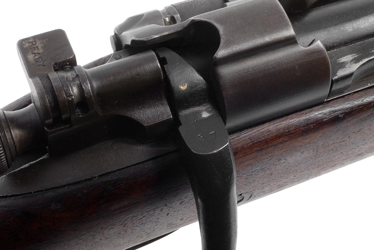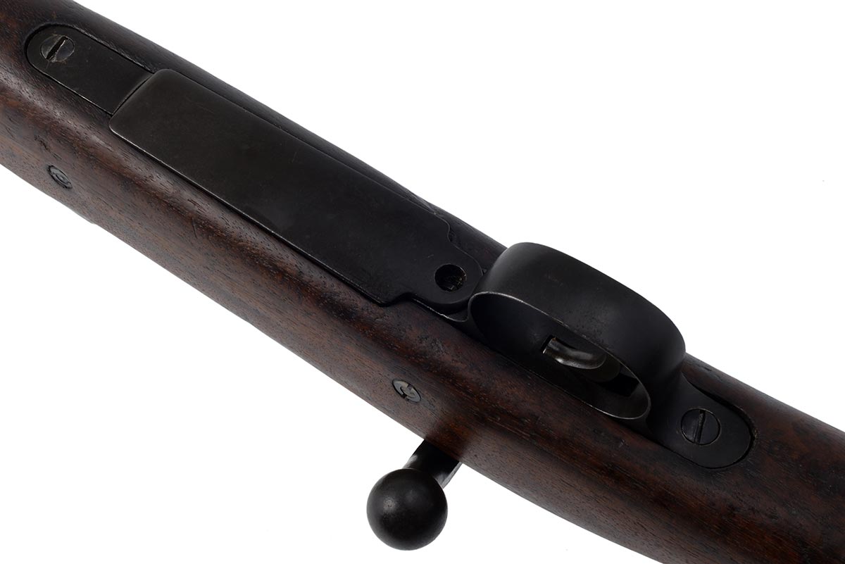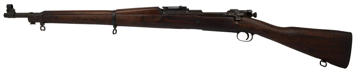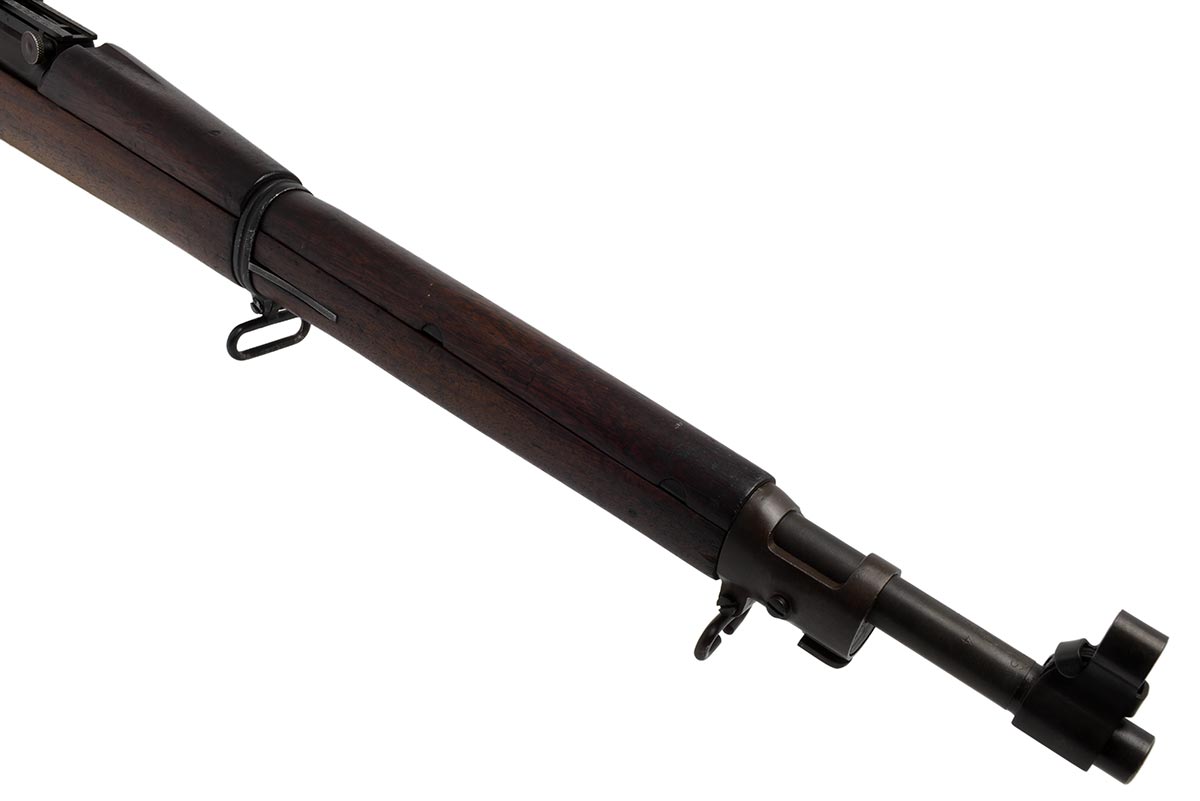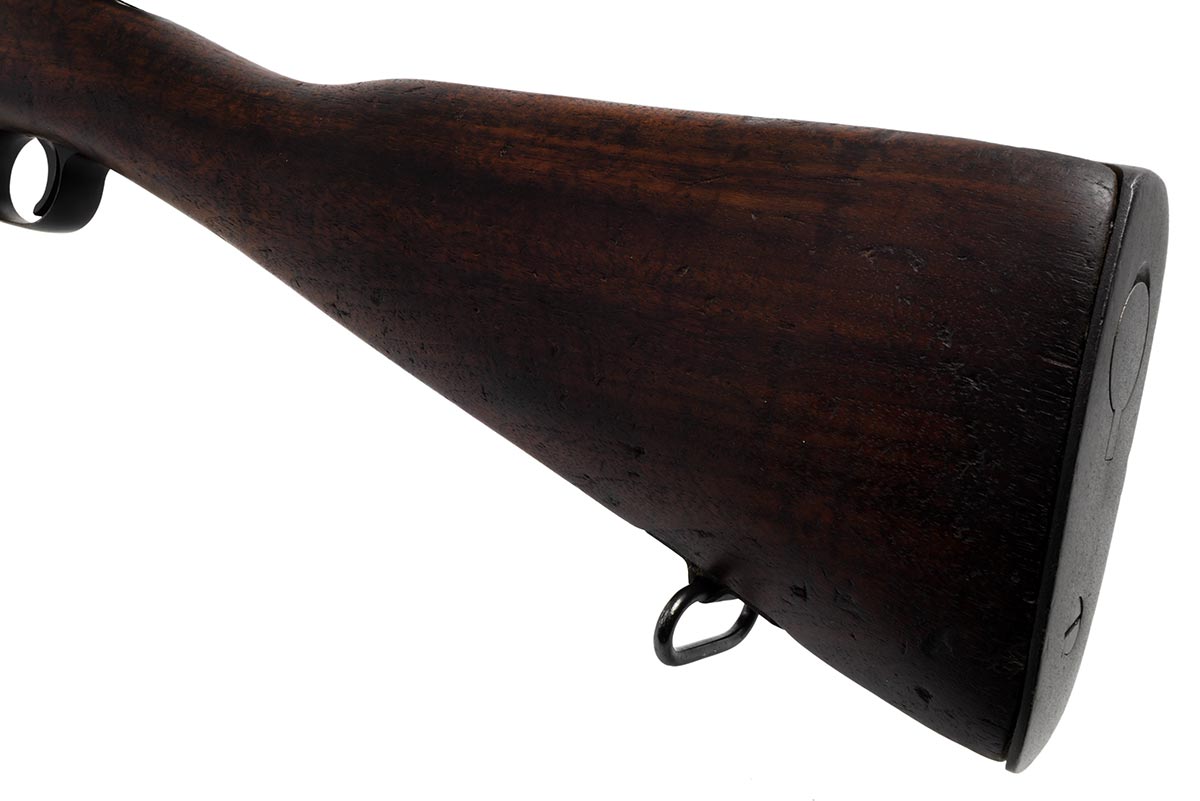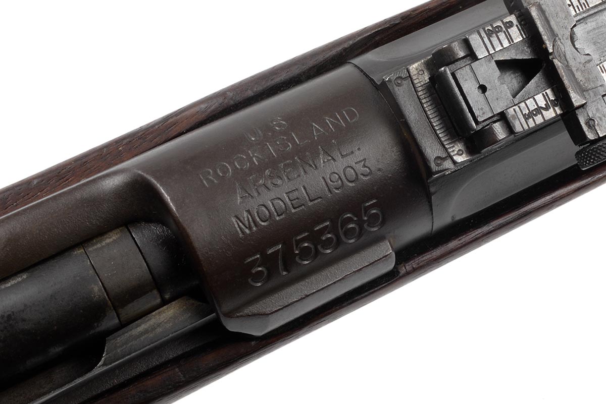 This a Rock Island Arsenal Model 1903 rifle chambered in 30-06. It features a desirable High Standard 24-inch 4-groove barrel dated "7-44"; parkerized finish, early straight "S" stock, and 5-round internal magazine. The serial number indicates this rifle was manufactured in 1918, but was arsenal reworked for service during WW2. Overall condition is good with a bright shiny bore and strong rifling. The metal retains most of the original finish. The wood is in nice original shape with some scuffs, scratches nicks and pressure marks. This would make a nice addition to a WW2 firearms collection. Buy online today!