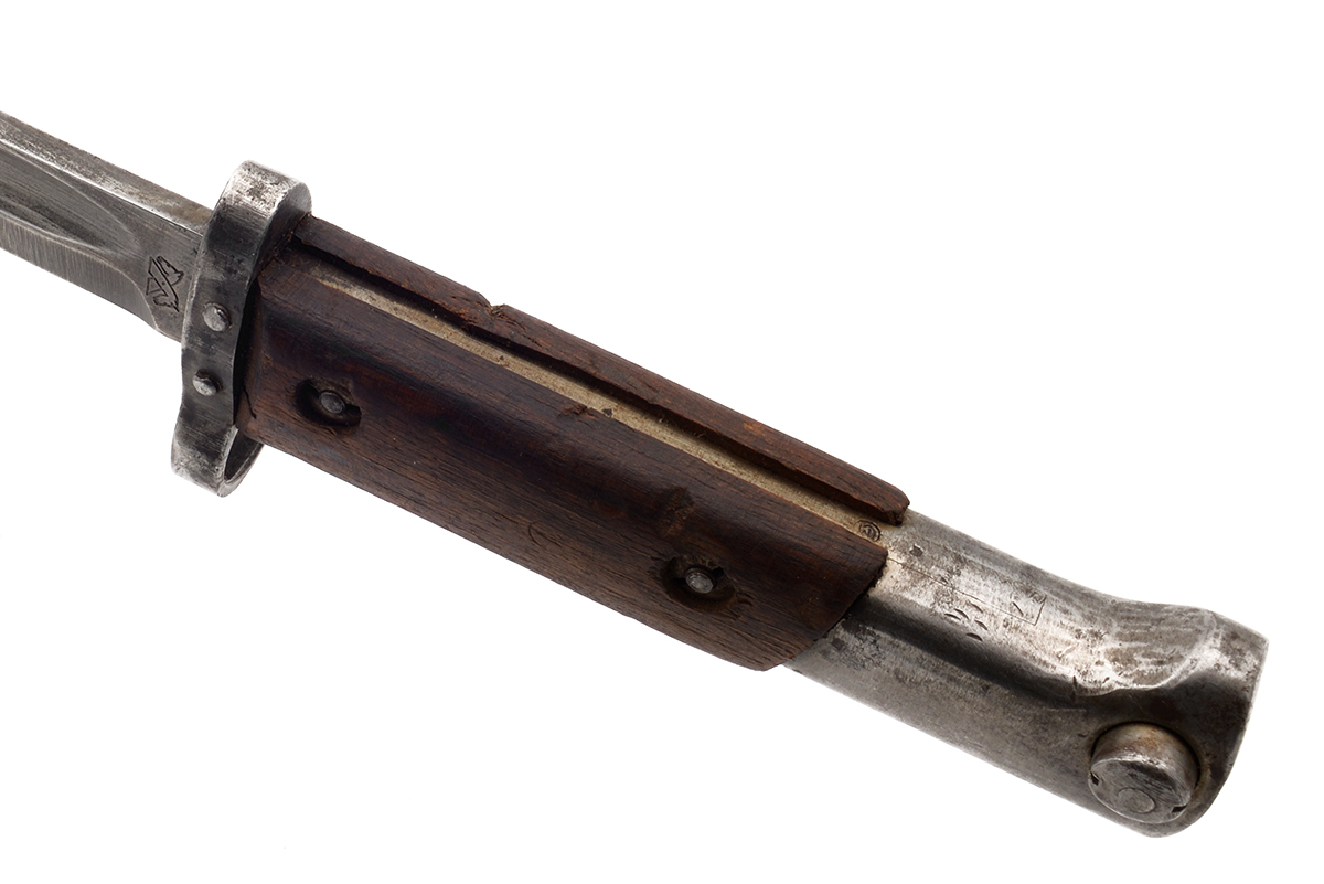 This is a Romanian VZ-24 bayonet for the Mauser rifle. It features an 11.75" blade and total length of 17", the ricasso is marked with the double horse head logo of the Austrian company Redtenbacher who had a joint venture in Sibiu, Romania. Overall condition of the bayonet is good with the original edge, there is some tarnishing and patina to the metal along with some chips and nicks to the wood grip panels. The scabbard has a fair amount of wear to the finish along with some patina and dents. Buy online today!