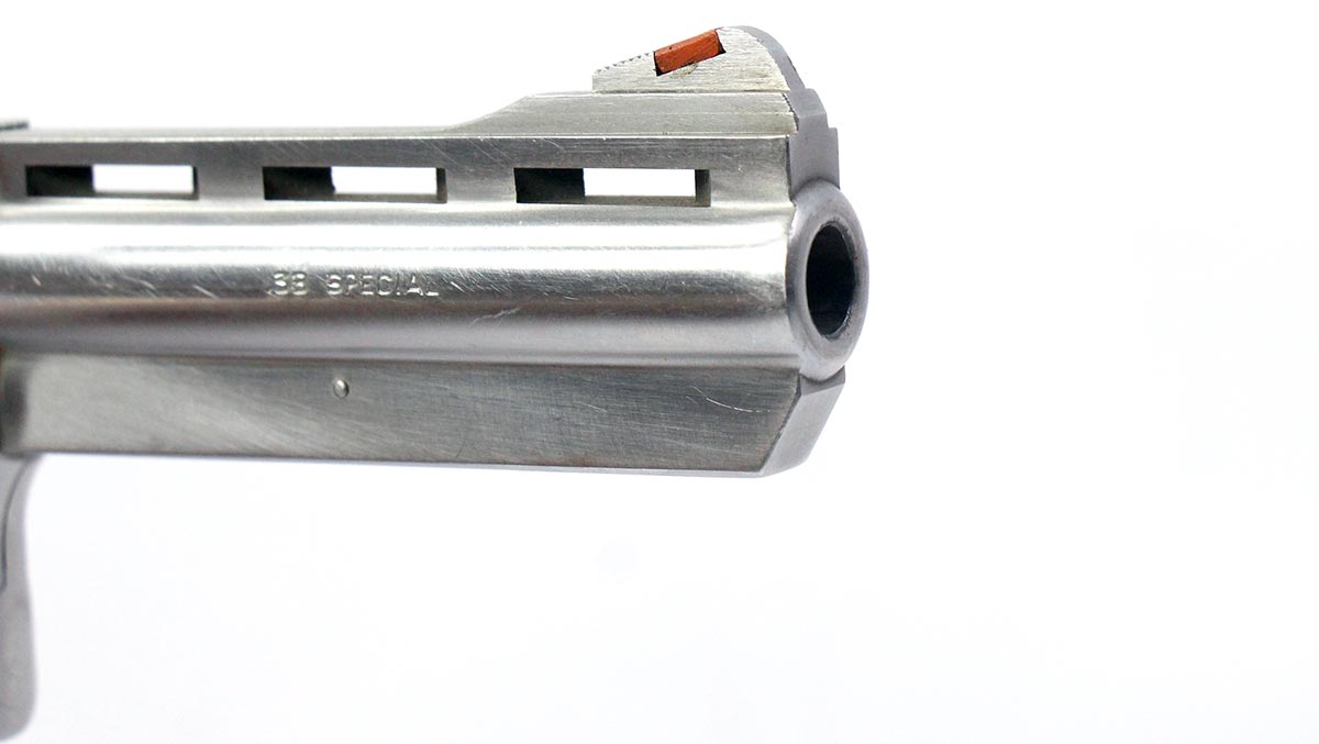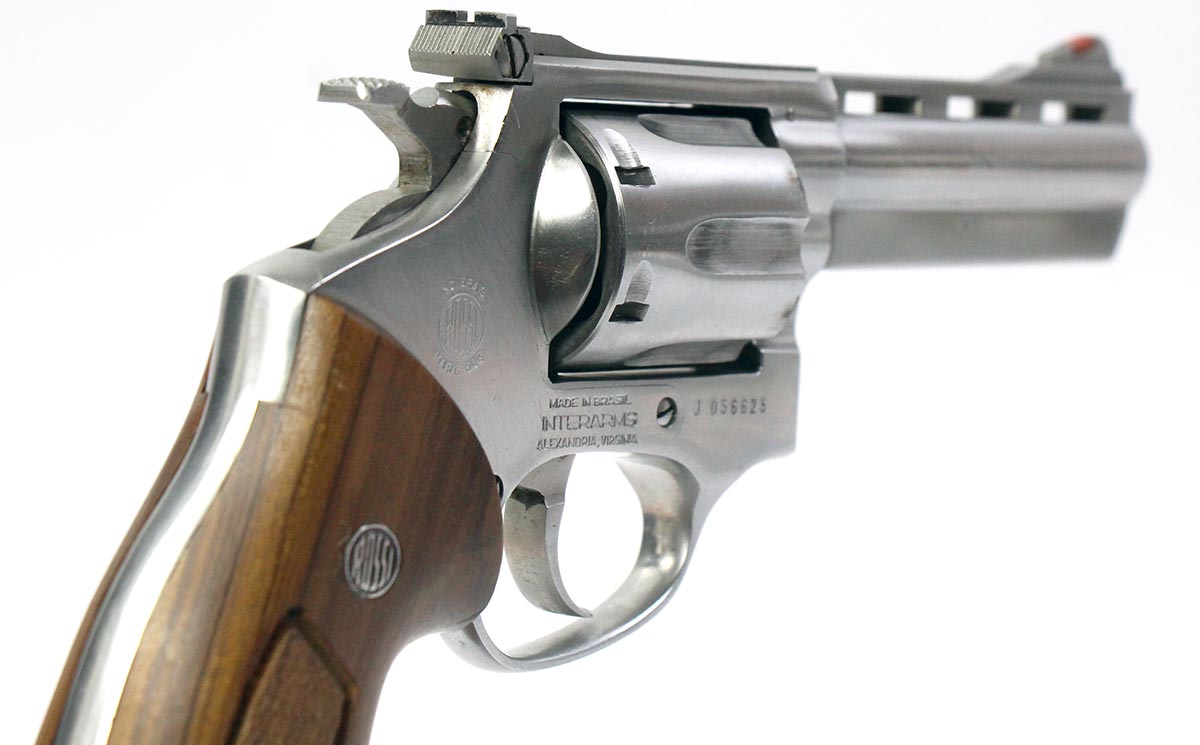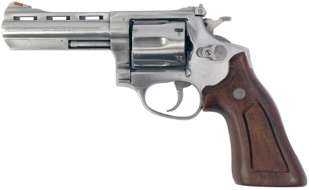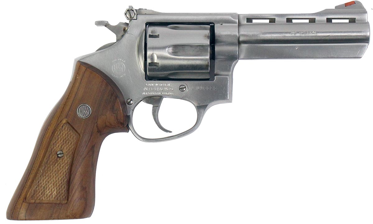 This is a used Rossi Model 851 revolver chambered in 38 Special. It features a 4-inch vent rib barrel, 6-round cylinder, adjustable rear sight, red ramp front sight, wood grips, and stainless finish. Overall, this revolver is in good condition with normal use cylinder turn lines. This would be a good choice for target shooting. Buy online today!