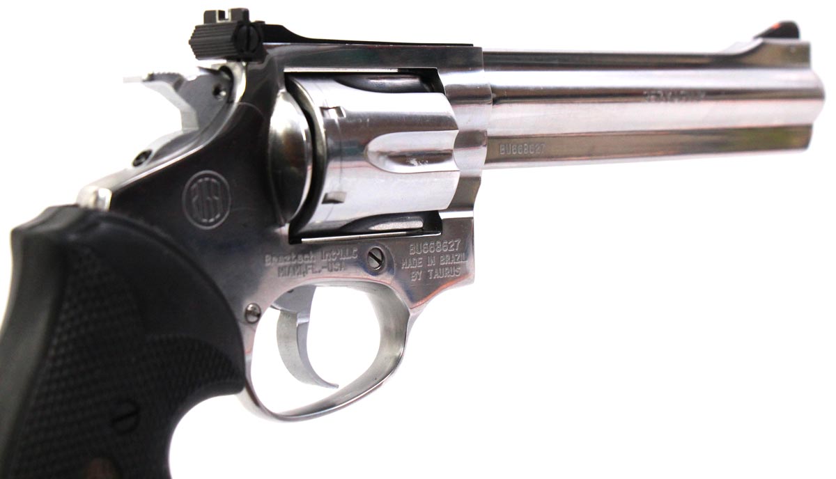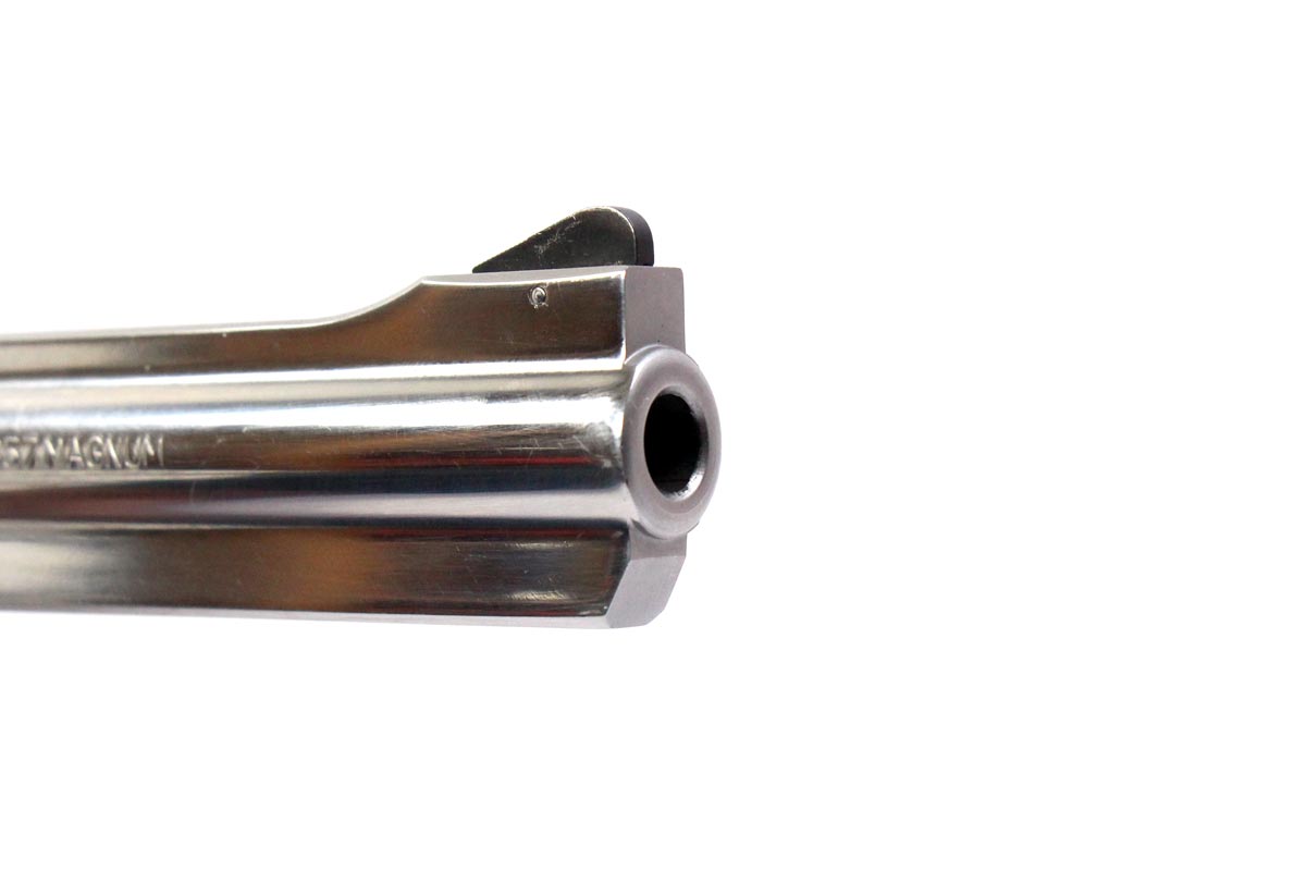 This is a used Rossi Model 972 revolver chambered in 357 Magnum. It features a 6-inch barrel, 6-round cylinder, adjustable rear sight, internal lock, rubber grips, and stainless finish. Overall, this revolver is in good condition with handling wear on the frame and normal use cylinder turn lines. This would be a good choice for target shooting. Buy online today!