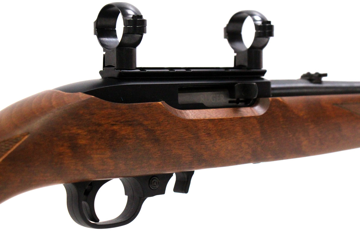This is a used Ruger 10/22 Sporter rifle chambered in 22 Long Rifle. It features a 22-inch barrel, 10-round magazine, open sights, 1-inch scope rings, cross-bolt safety, wood stock, and blued finish. Overall, this Ruger is in good condition with some handling wear on the stock. Bore condition is good with crisp rifling. This would be a good choice for target shooting or small game hunting. Buy online today!