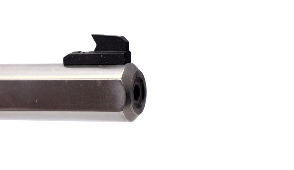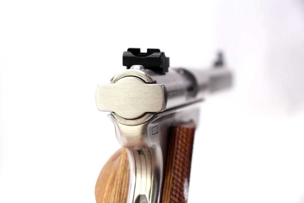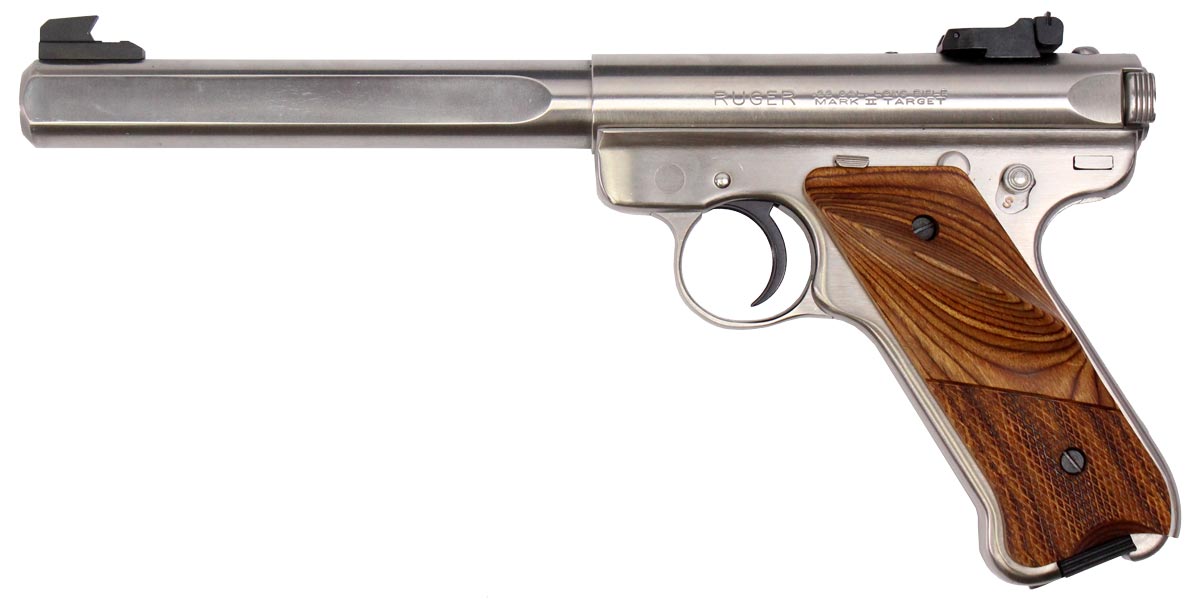 This is a used Ruger MKII Competition Target pistol chambered in 22 Long Rifle. It features a 6.75-inch slab side barrel, 10-round magazines, adjustable rear sight, stainless finish, and wood grips. Includes factory box, scope rail, 1-inch rings, and two magazines. Overall, this Ruger is in good condition with normal handling wear on the barrel and frame. Based on Ruger's serial lookup, this pistol was manufactured in 2005. This would be a good choice for target shooting. Buy online today!