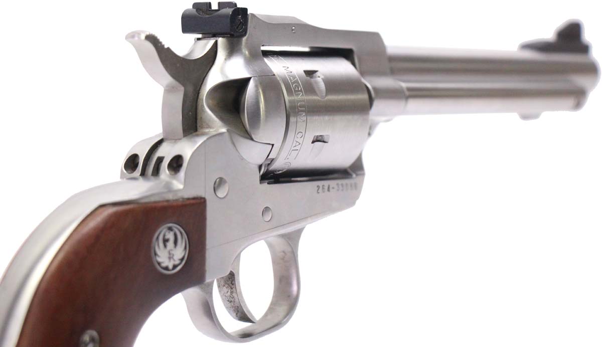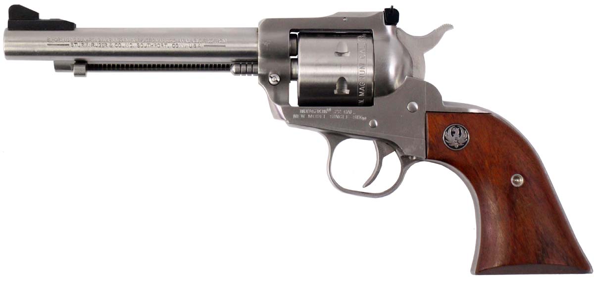 This is a used Ruger New Model Single Six revolver chambered in 22 Magnum. It features a 5.5-inch barrel, 6-round cylinder, adjustable rear sight, transfer bar safety, stainless finish, and wood grips. Overall, this Ruger is in good condition with normal cylinder turn lines. This would be a good choice for target shooting. Buy online today!