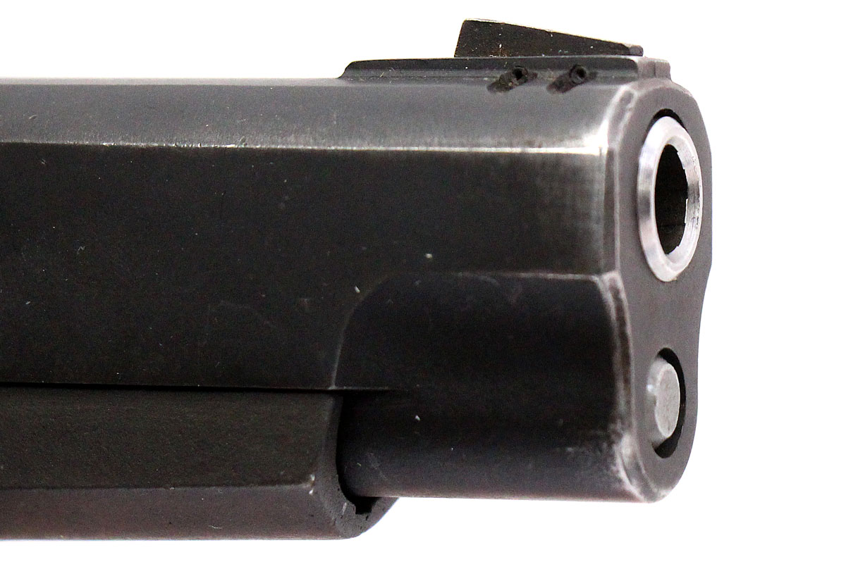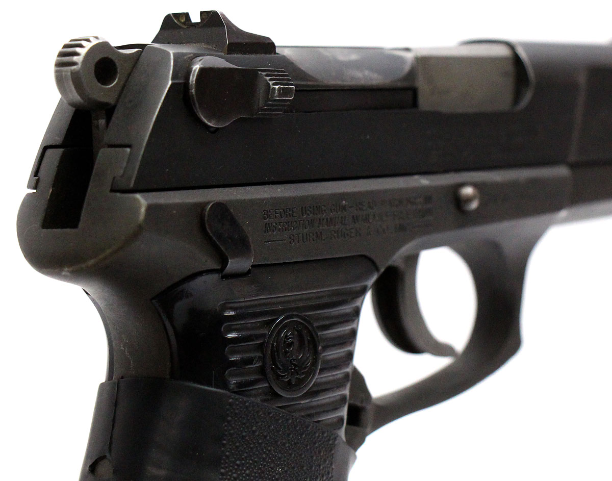 This is a used Ruger P85 pistol chambered in 9mm. It features a 4.5-inch barrel, 15-round magazine, fixed sights, ambidextrous safety/decocker, polymer grips with rubber grip sleeve, and aluminum frame. Overall, this Ruger is in good condition with significant finish wear throughout the slide. The right side of the magazine release is missing but remains functional for right-handed use. This would be a good choice for home defense. Buy online today!