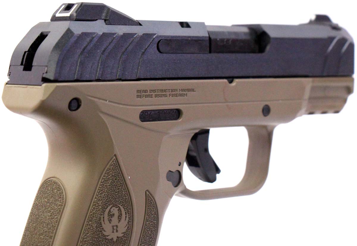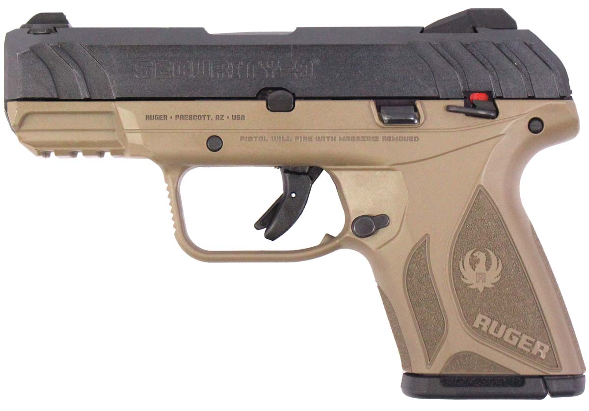This is a used Ruger Security 9 Compact pistol chambered in 9mm. It features a 3.42-inch barrel, one 10-round magazine, contrast sights, thumb safety, flat dark earth frame, and accessory rail. Overall, this Ruger is in good condition with normal wear on the slide and barrel. This would be a good choice for concealed carry. Buy online today!