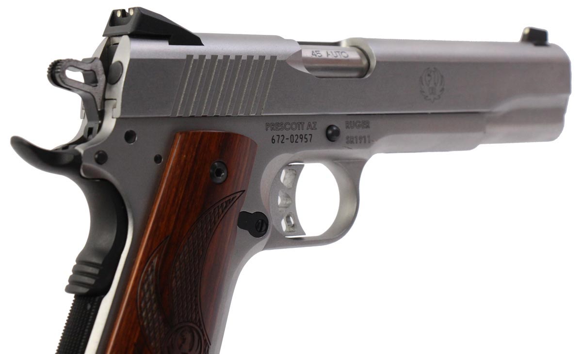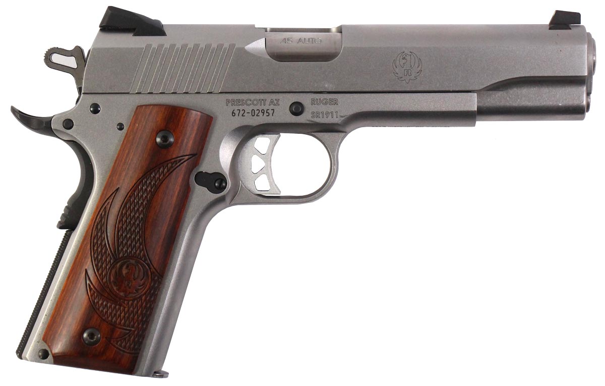 This is a used Ruger SR 1911 Stainless pistol chambered in 45 ACP. It features a 5-inch barrel, 7-round magazine, fixed sights, thumb safety, grip safety, checkered wood grips, and stainless finish. Overall, this pistol is in good condition with normal use wear on the barrel, slide, and frame. This would be a good choice for home defense. Buy online today!