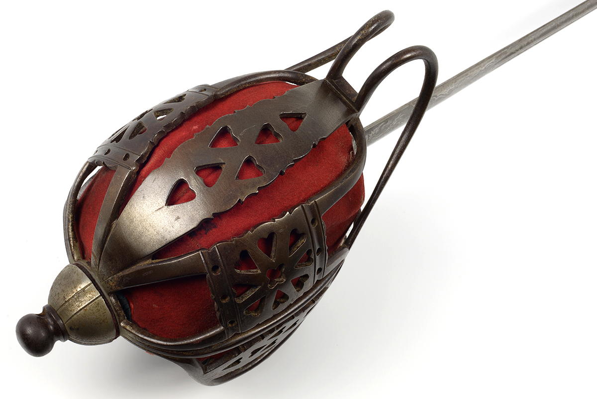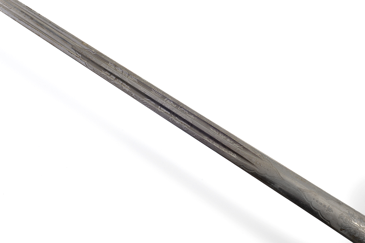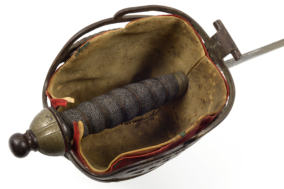 This is a Scottish 1828 Pattern Highland Officers Basket Hilt Sword. It features a 31.5" engraved double fuller steel blade, total length of 38", steel basket hilt guard with leather and felt lining and wire wrapped ray skin handle. The ricasso is marked "J.CUMMING 1 ENGLISH ST DUMFIRES" on one side and proof marked on the other. The blade features the H.M. Queen Victoria Royal Cypher (crown over VR) who reigned between 1837 and 1901, we could find no information about the retailer named on the ricasso. Overall condition is good with the original edge, the blade some tarnishing and light scratches but the engraving is well defined, the guard has patina and lining could use a good cleaning.Included is the original scabbard that has been painted silver at some point, it has scuffs, scratches and a few dents. Buy online today!