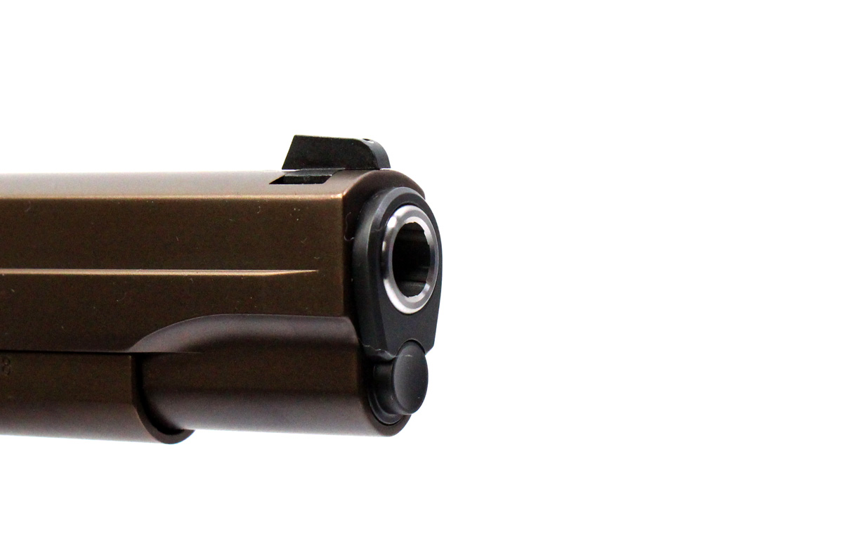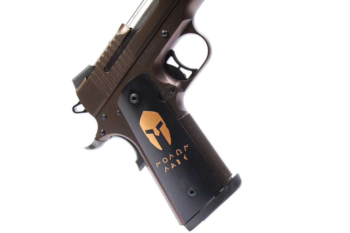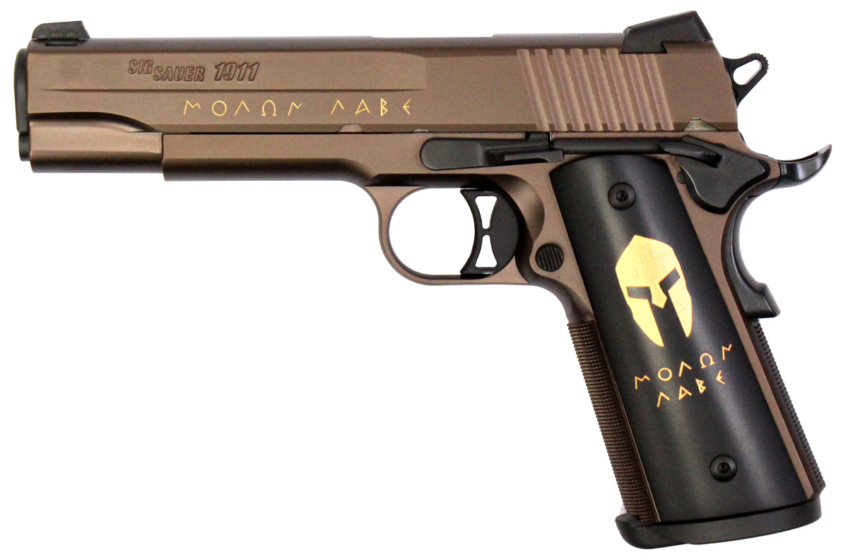 This is a used Sig Sauer 1911 Spartan pistol chambered in 10mm. It features a 5-inch barrel, 8-round magazines, night sights, grip safety, thumb safety, and burnt bronze finish. Includes factory box and two magazines. Overall, this pistol is in good condition with normal use wear on the barrel. This would be a good choice for target shooting. Buy online today!