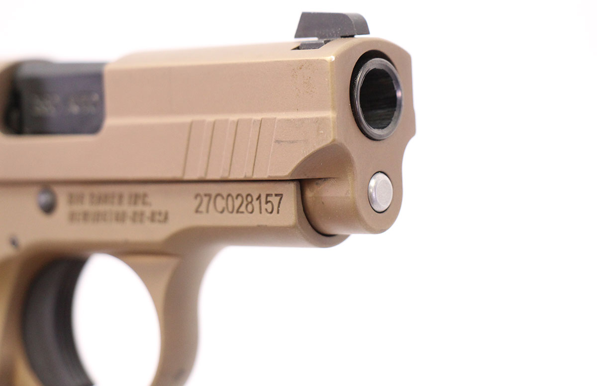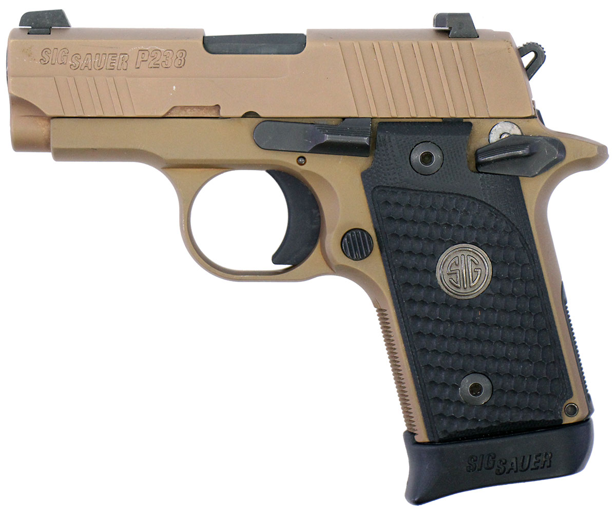 This is a used Sig Sauer P238 Emperor Scorpion pistol chambered in 380 ACP. It features a 2.7-inch barrel, 7-round magazine, manual safety, G10 grips, burnt bronze finish, and night sights. Overall, this P238 is in good condition with normal use wear on the slide, barrel, and frame. This would be a good choice for concealed carry. Buy online today!