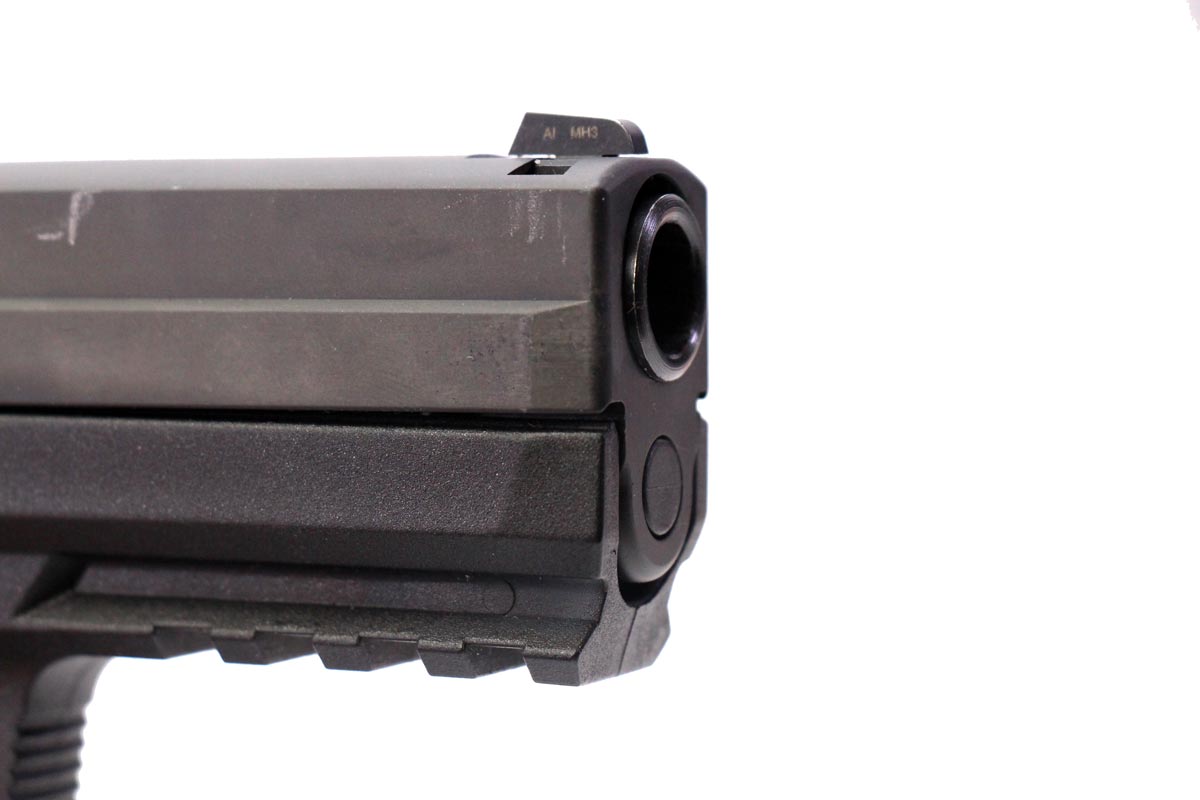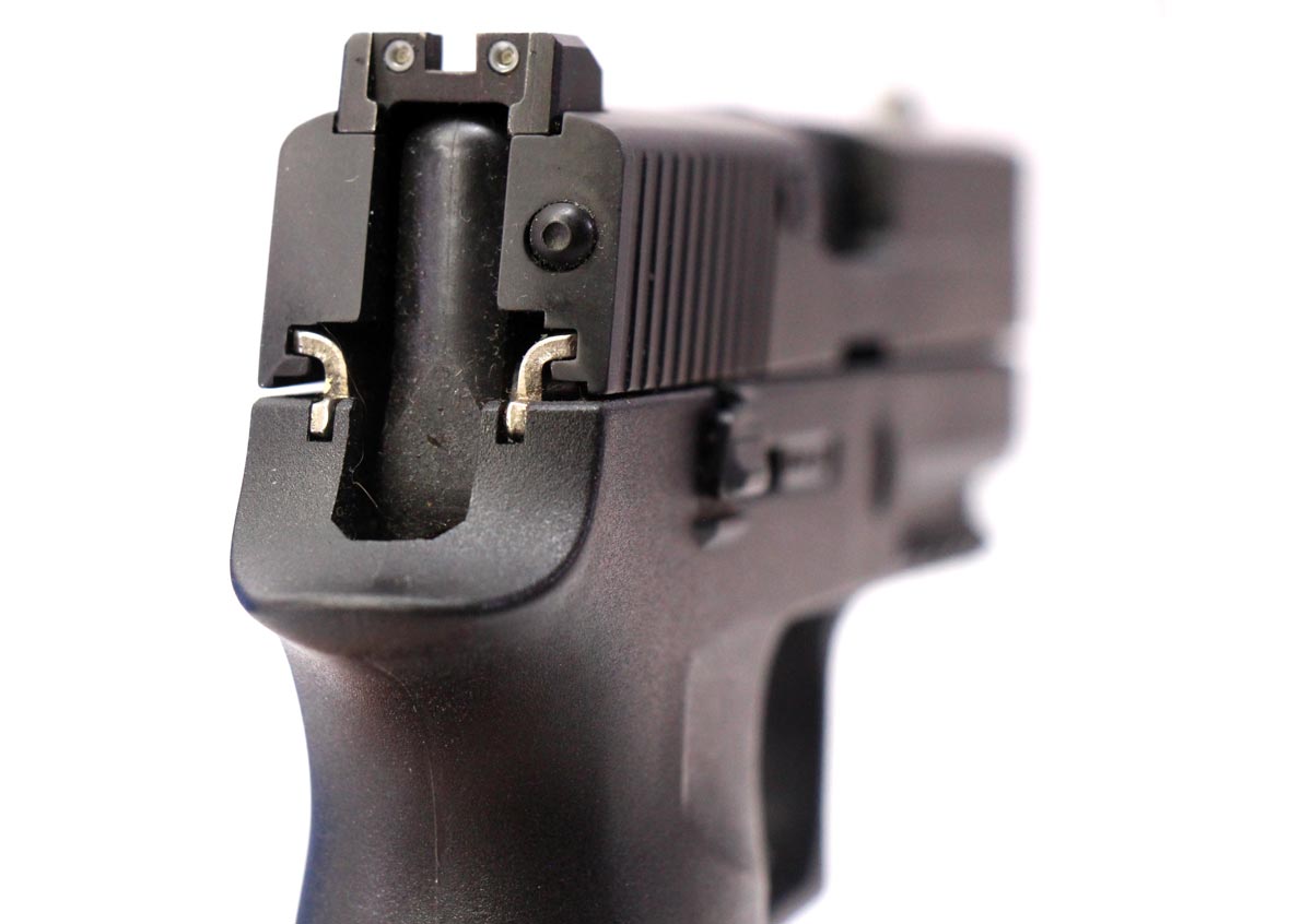 This is a used Sig Sauer P250 Compact pistol chambered in 45 ACP. It features a 3.9-inch barrel, 9-round magazines, night sights, and accessory rail. Includes factory box and two magazines. Overall, this Sig is in good condition with normal wear on the slide and barrel. Due to age, the tritium in the night sights are dim. This would be a good choice for home defense. Buy online today!