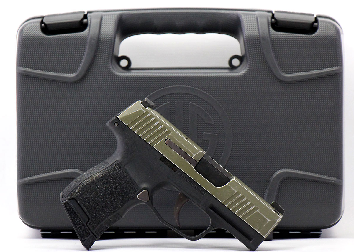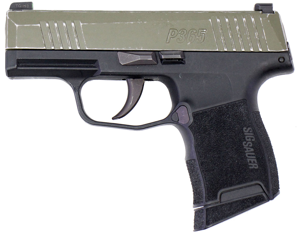 This is a used Sig Sauer P365 pistol chambered in 9mm. It features a 3.1-inch barrel, 10-round magazine, night sights, green Cerakote finish, and accessory rail. Includes factory box, instruction manual, and two 10-round magazines. Overall, this Sig is in good condition with normal wear on the barrel and slide. The slide shows significant finish wear. The magazine release has been switched to the right side for left handed use. This would be a good choice for concealed carry. Buy online today!