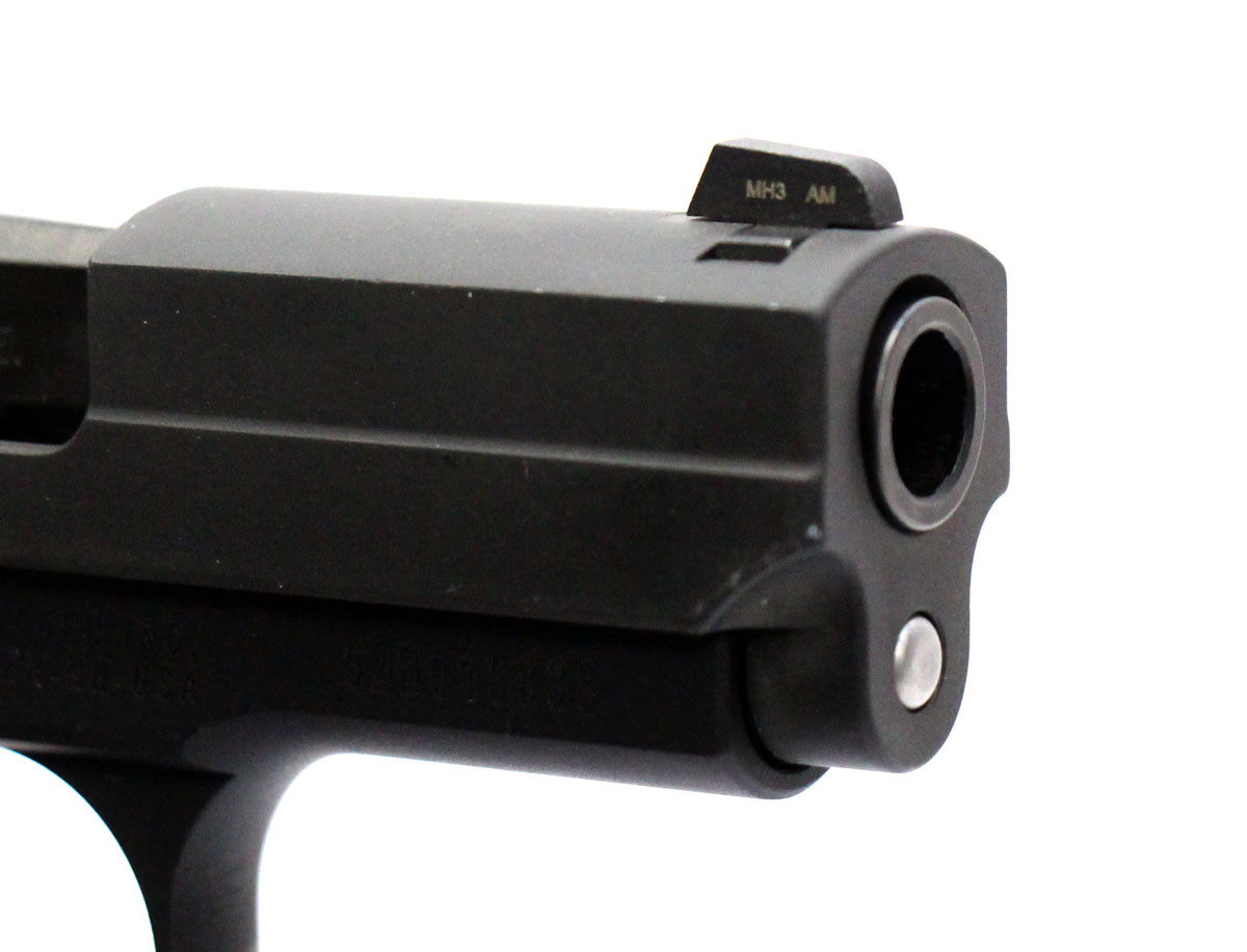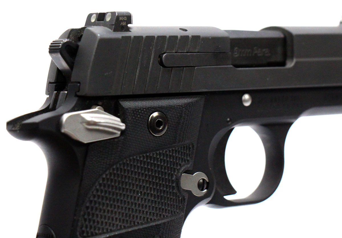 This is a used Sig Sauer P938 pistol chambered in 9mm. It features a 3-inch barrel, 7-round magazine, ambidextrous thumb safety, night sights, black finish, nickel controls, and G10 grips. Includes factory box and manual. Overall, this Sig is in good condition with normal wear on the barrel, slide, and frame. This would be a good choice for concealed carry. Buy online today!