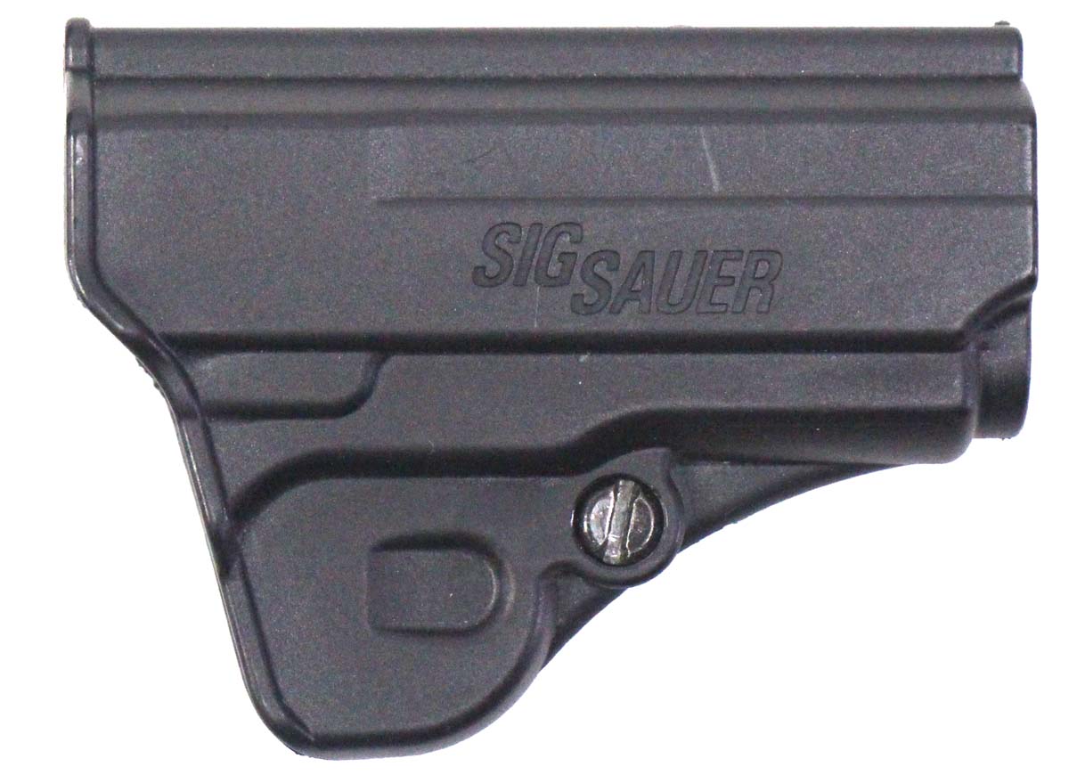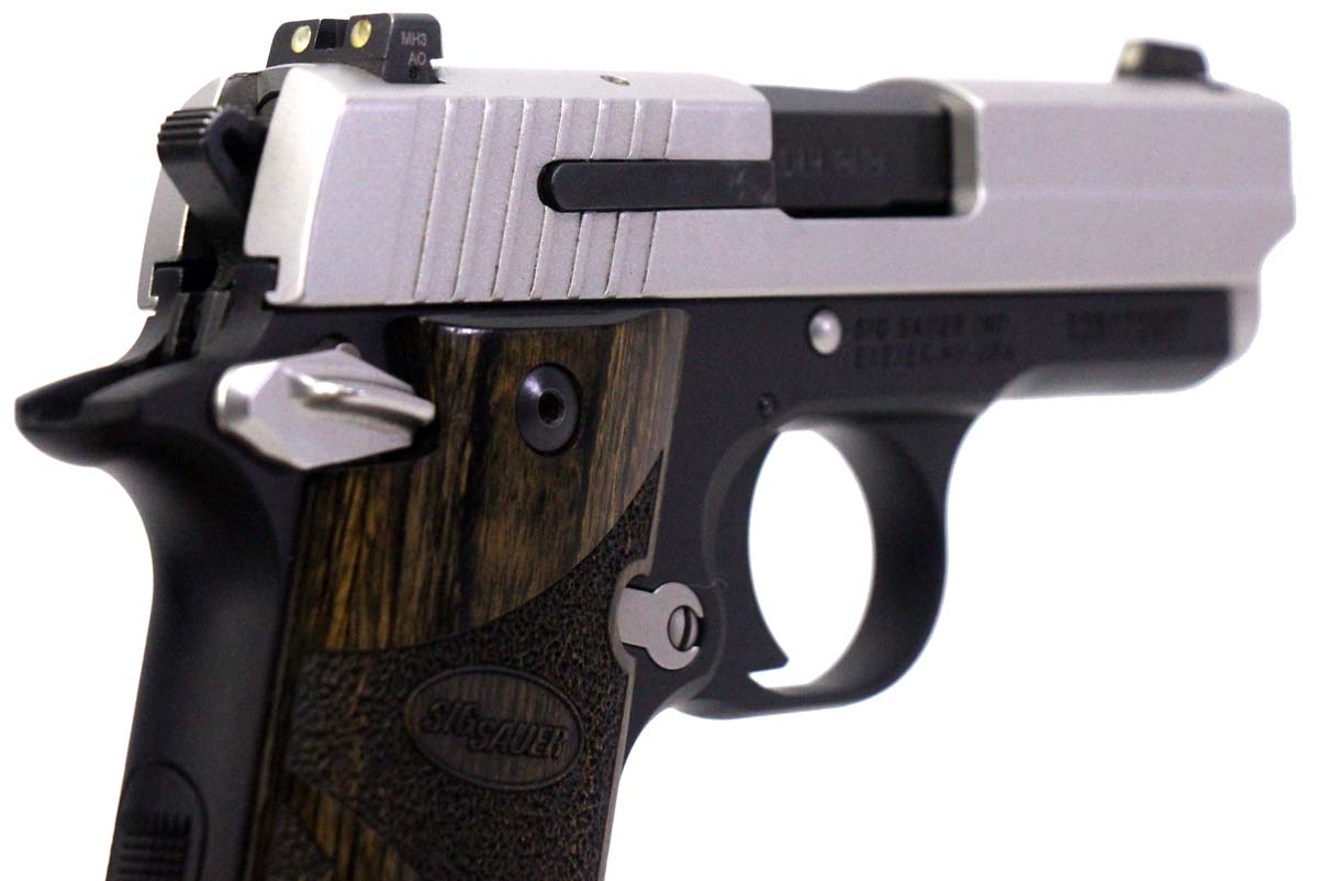 This is a used Sig Sauer P938 pistol chambered in 9mm. It features a 3-inch barrel, one 6-round magazine, night sights, ambidextrous thumb safety, and wood grips. Includes factory box, and right-handed belt holster. Overall, this Sig is in good condition with normal wear on the slide and barrel. This would be a good choice for concealed carry. Buy online today!
