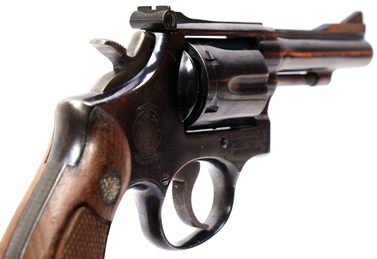 This is a vintage Smith & Wesson Model 15-3 revolver chambered in 38 Special. It features a 4-inch pinned barrel, 6-round cylinder, blued finish, checkered wood grips with Smith & Wesson medallions, adjustable rear sight, and no internal lock. Overall, this Smith is in good condition with handling wear on the frame and bluing wear toward the muzzle. The cylinder shows normal use turn lines. This would be a good choice for target shooting. Buy online today!