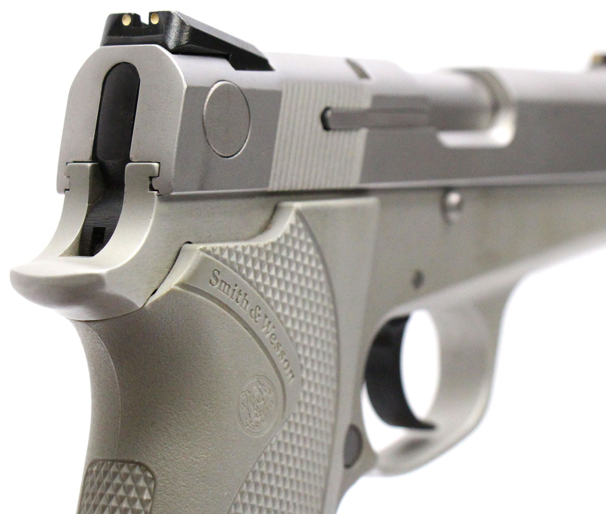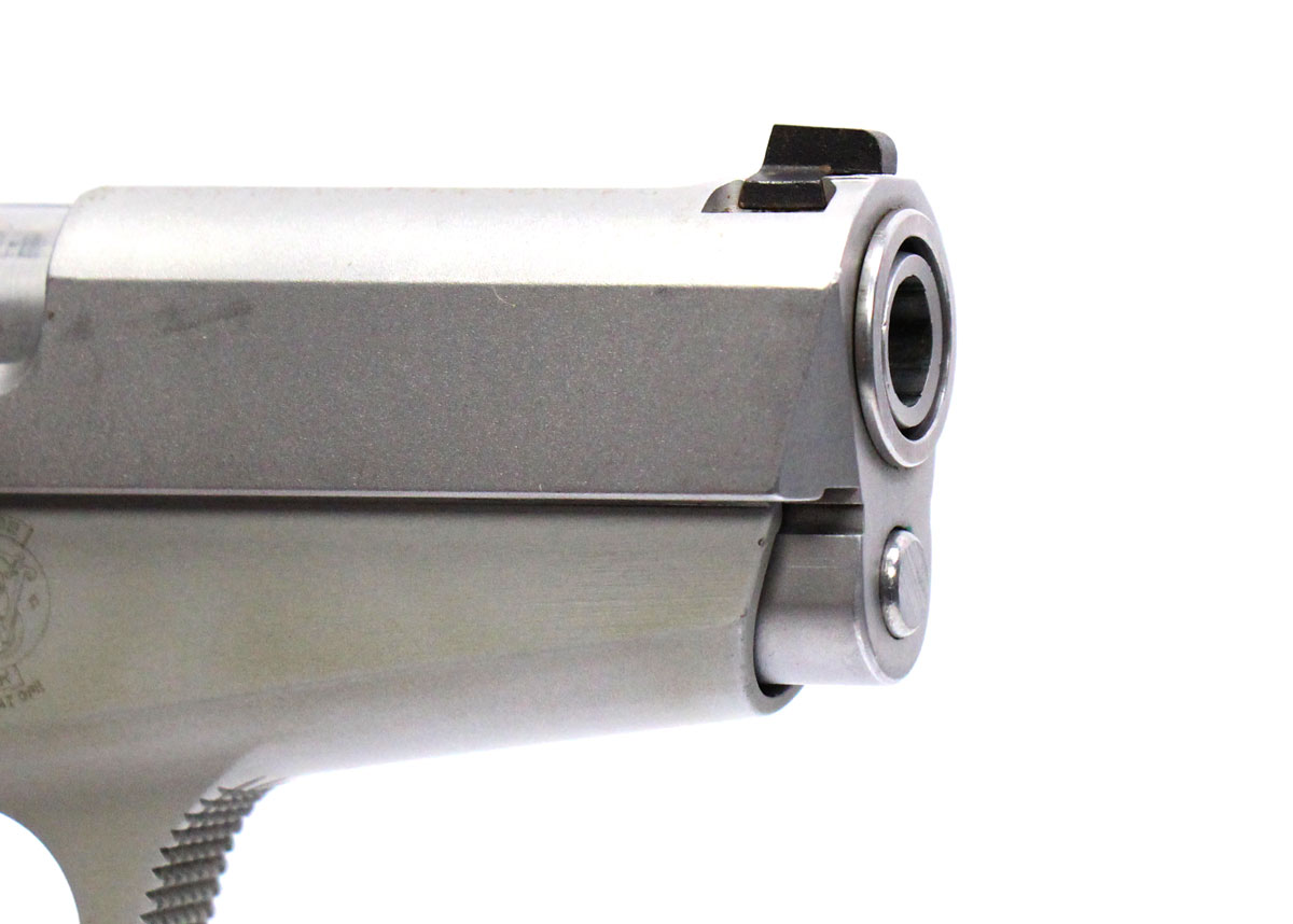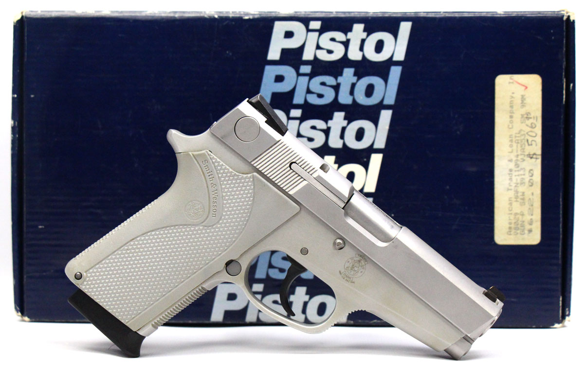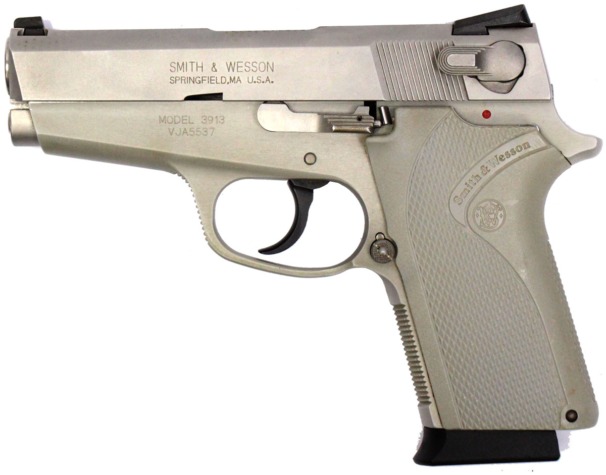This is a used Smith & Wesson 3913 pistol chambered in 9mm. It features a 3.5-inch barrel, 8-round magazine, fixed sights, ambidextrous thumb safety/decocker, magazine disconnect safety, alloy frame, and stainless finish. Includes factory box and five magazines. Overall, this Smith is in good condition with normal wear on the slide and barrel. This would be a good choice for concealed carry. Buy online today!