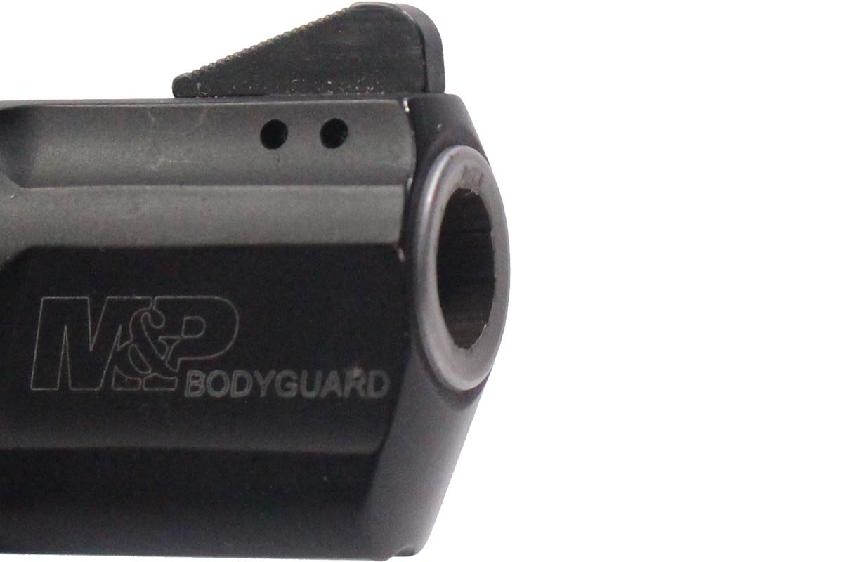 This is a used Smith & Wesson Bodyguard 38 revolver cambered in 38 Special. It features a 1.87-inch barrel, 5-round cylinder, rubber grips, and Crimson Trace red laser sight. Overall, this Smith is in good condition with normal-use cylinder turn lines. This would be a good choice for concealed carry. Buy online today!