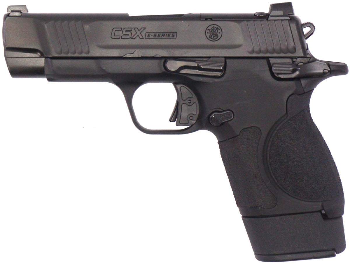 This is a used Smith & Wesson CSX E Series pistol chambered in 9mm. It features a 3.6-inch barrel, 15-round magazine, 3-dot sights, optics ready slide, ambidextrous thumb safety, and alloy frame. Includes factory box, one 12-round magazine, one 15-round magazine, one 17-round magazine, backstrap set, and instruction manual. Overall, this Smith is in very good condition with minimal wear. This would be a great choice for concealed carry. Buy online today!