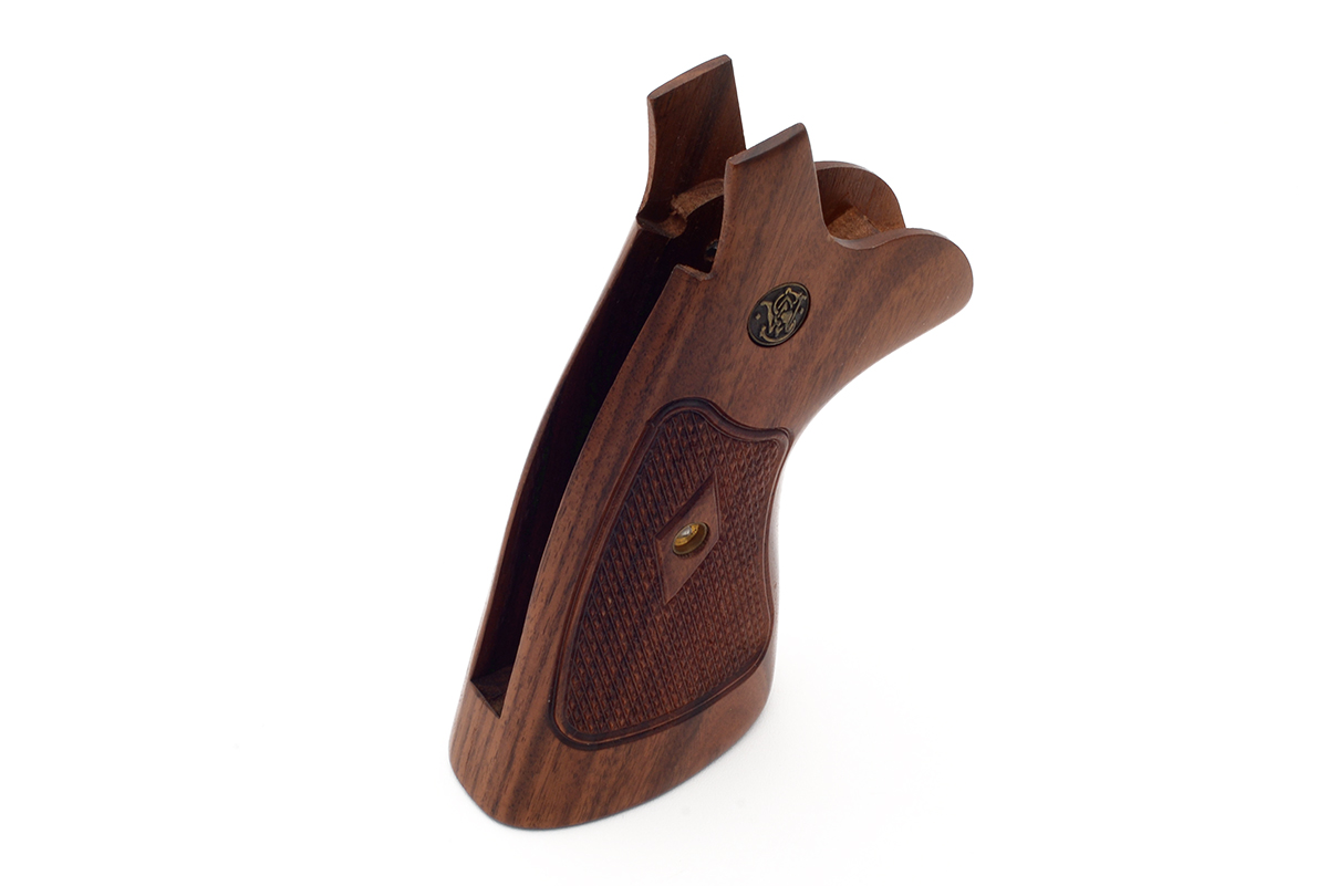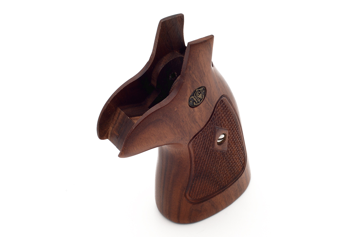 This is a set of pre-owned factory original Smith & Wesson N frame grips. It features wood square butt with checkering and inlaid S&W medallions. Overall condition is very good, they show barely any signs of use. Buy online today!