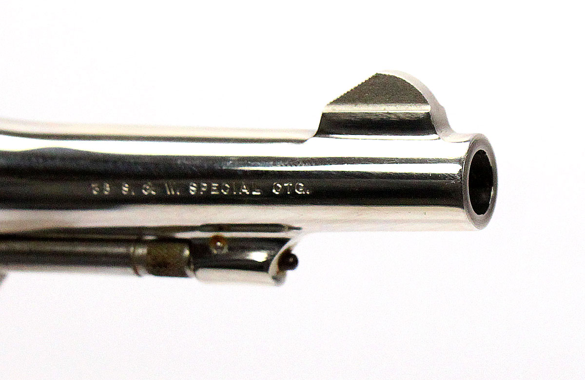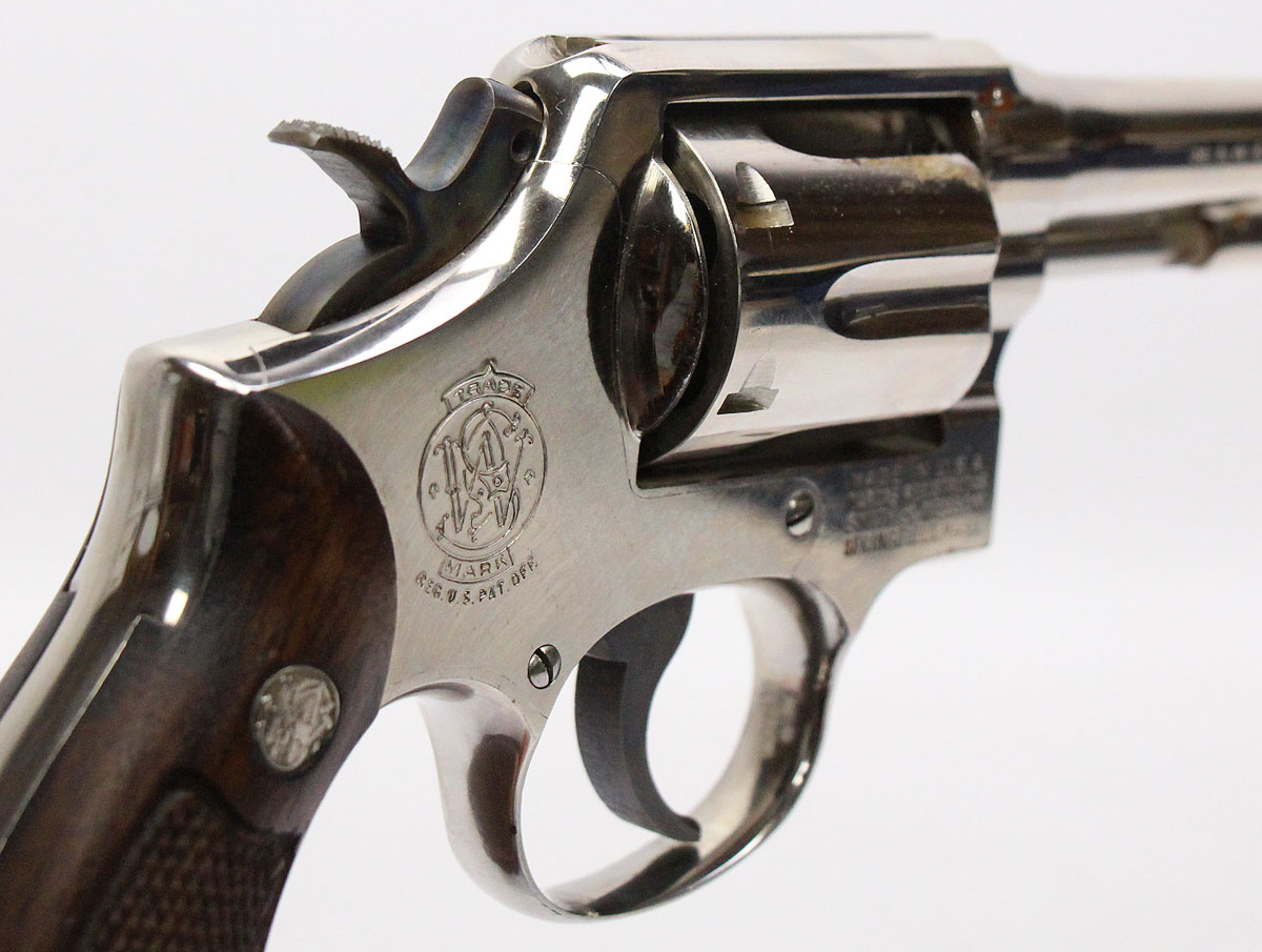 This is a used Smith & Wesson Model 10-5 revolver chambered in 38 Special. It features a 4-inch pinned barrel, 6-round cylinder, fixed sights, no internal lock, nickel finish, and checkered wood grips with Smith & Wesson medallions. Includes factory box. Overall, this Smith is in good condition with significant corrosion on the frame and cylinder. This would be a good choice for recreational target shooting. Buy online today!