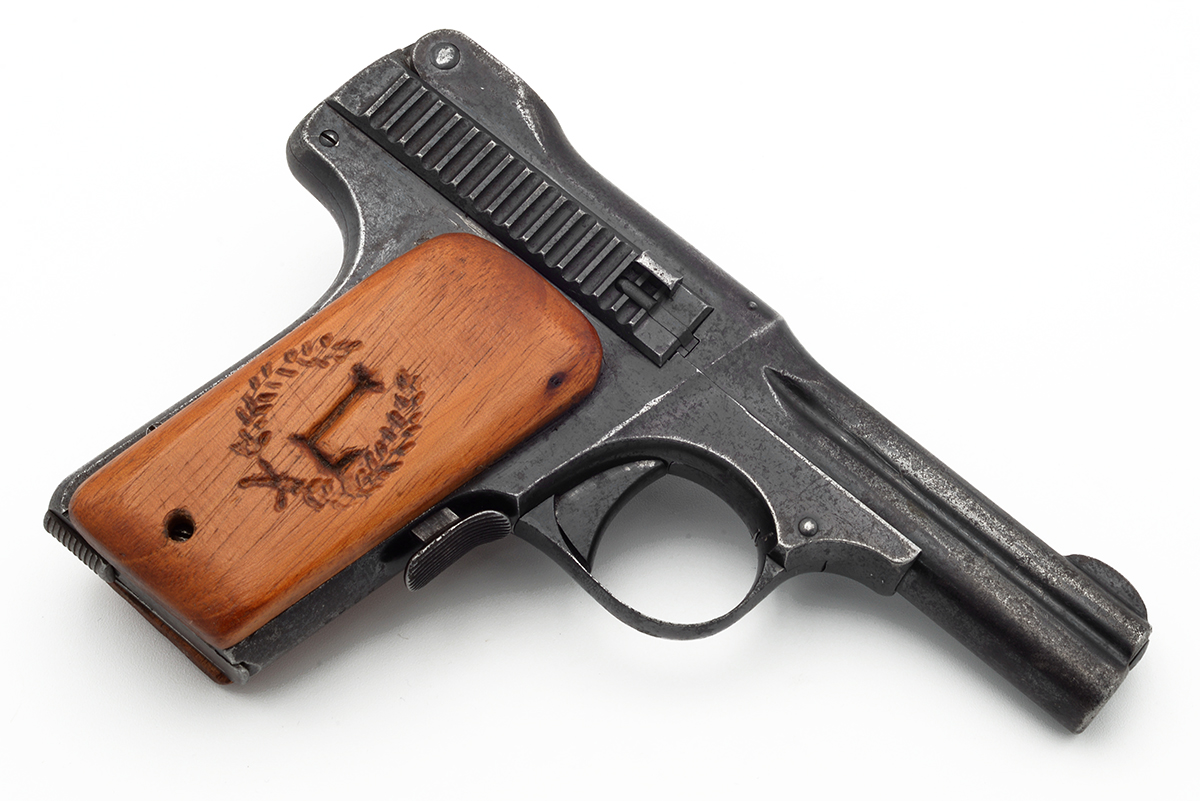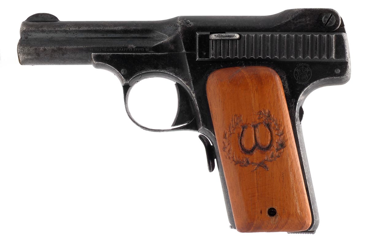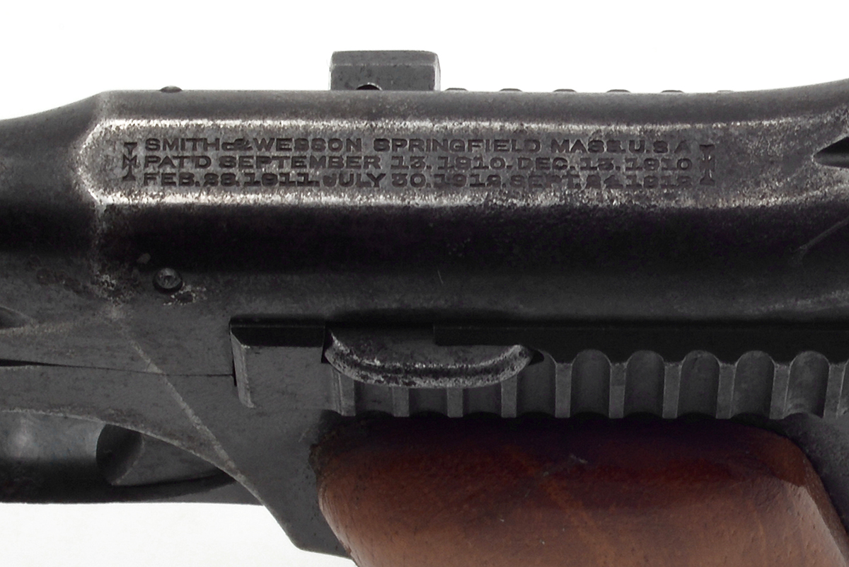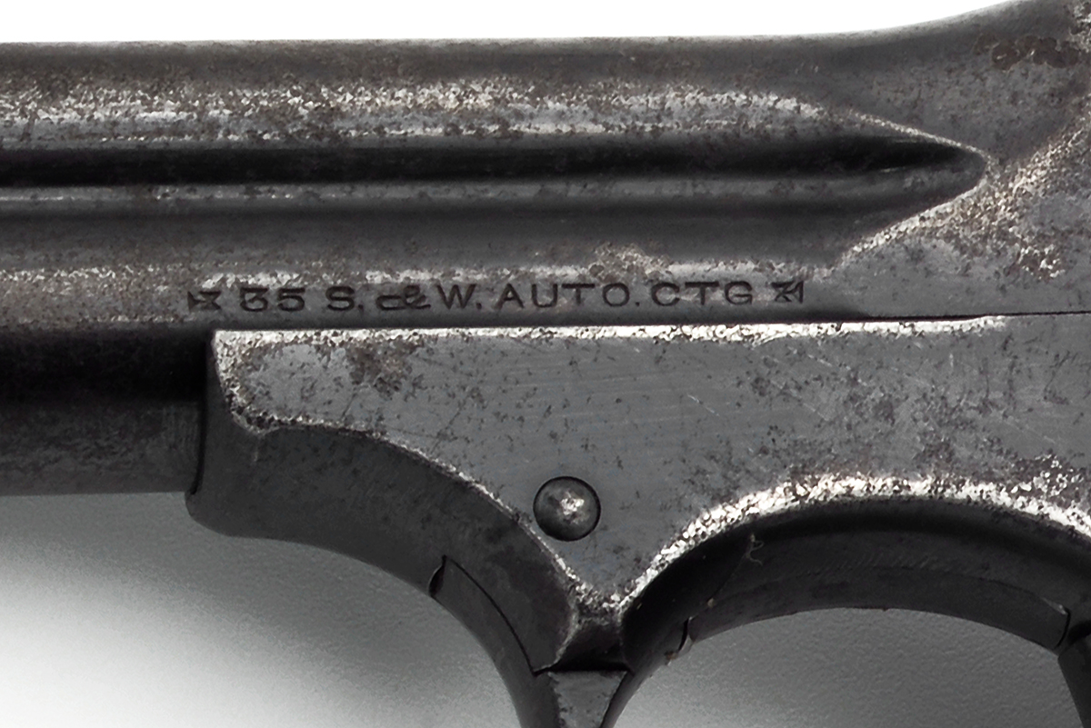 This is a Smith & Wesson Model 1913 pistol chambered in 35 S&W. It features a 3.5-inch barrel, hinged barrel assembly for easy cleanin,g and a very light bolt with a mainspring disconnector, so the slide could be cycled without fighting a heavy recoil spring. This was Smith & Wesson's very first semi-automatic handgun and used a proprietary .35 S&W cartridge with a magazine that hold seven rounds. Overall condition is fair. The bore is frosted with some light pitting and slightly worn rifling. Roughly 70% of the original bluing remains with patina and areas of light pitting and minor surface rust. The wood grips are homemade with carved Laurel leaf design around an "L" on one side and "W" on the other. Despite its condition, this is still a rare piece of Smith & Wesson history. Buy online today!