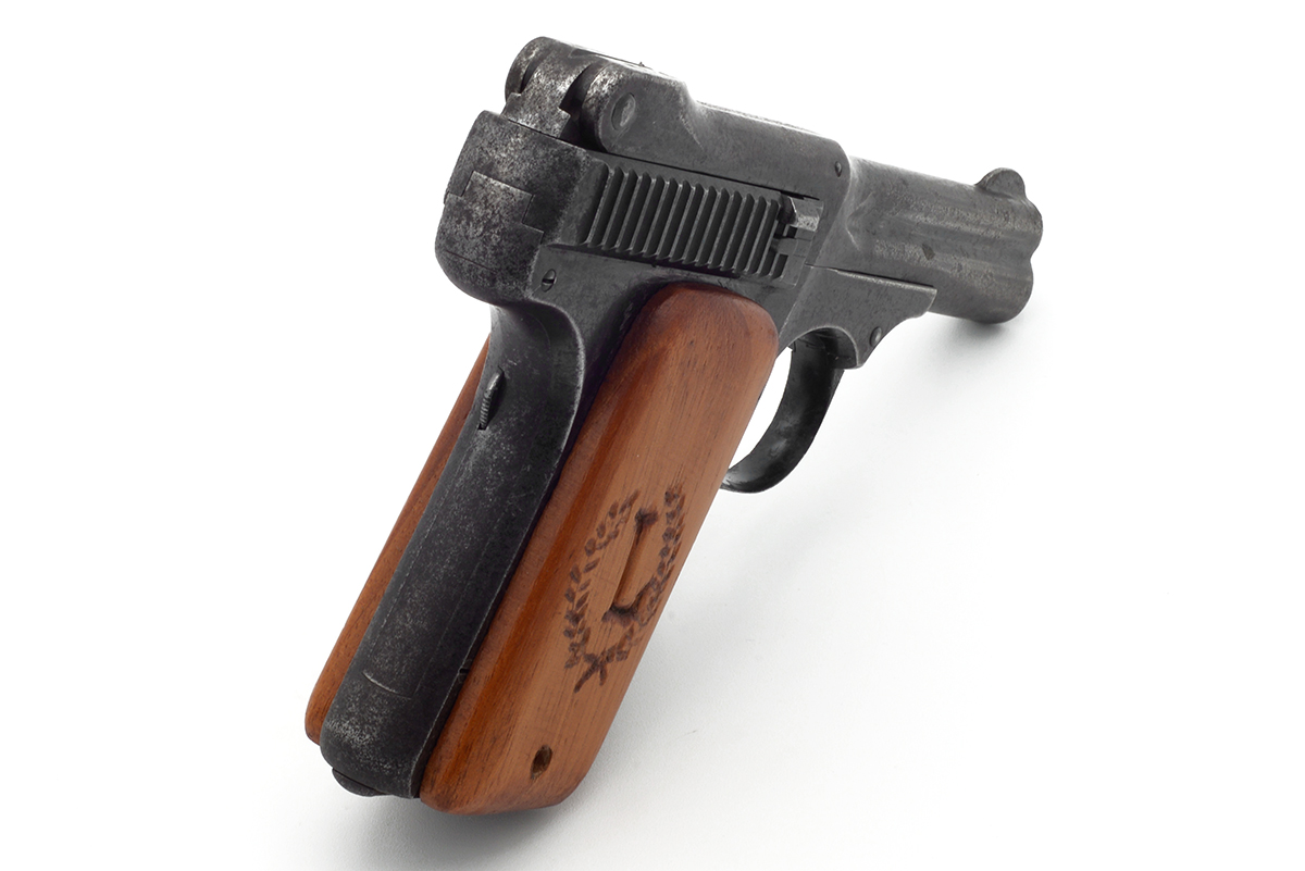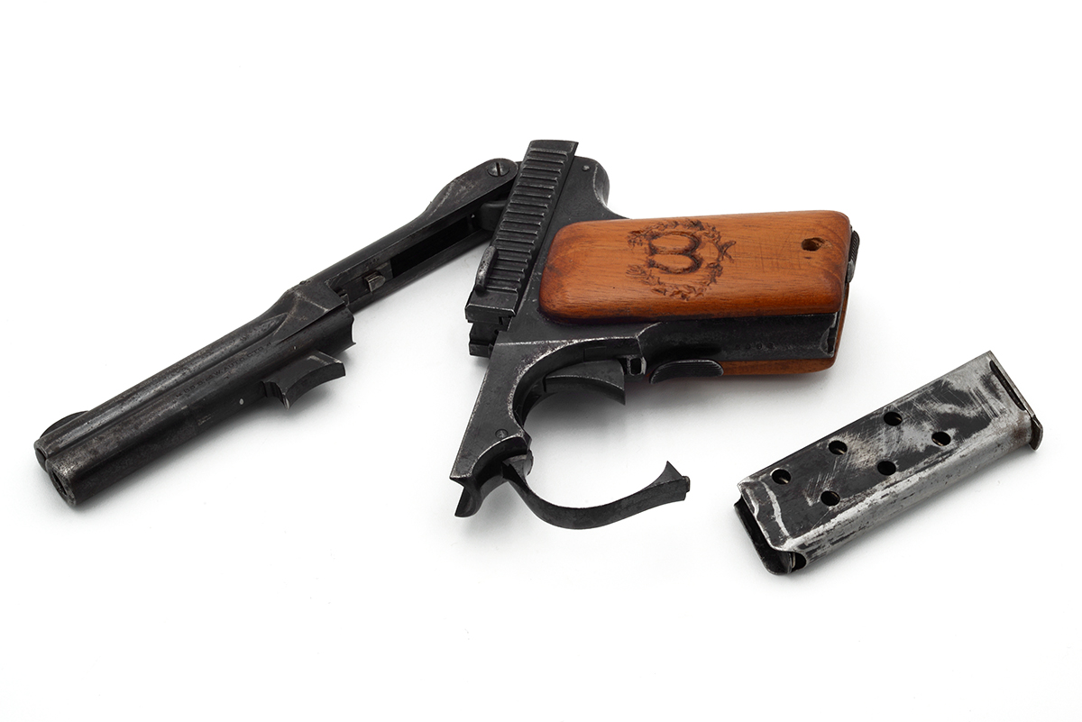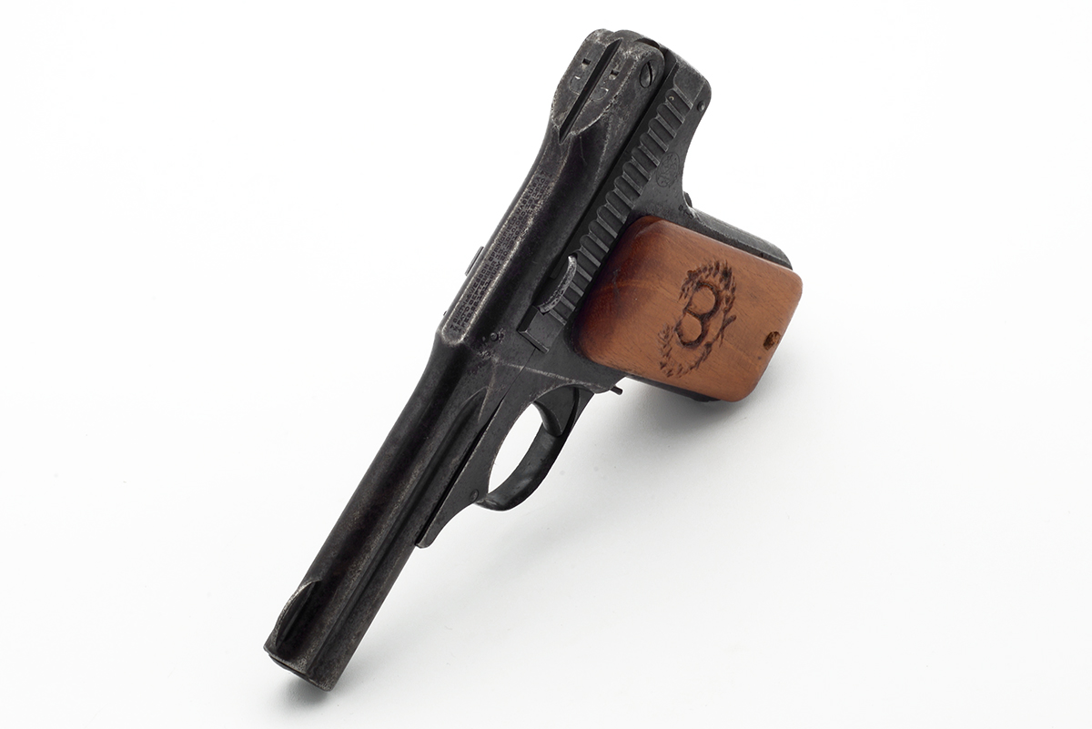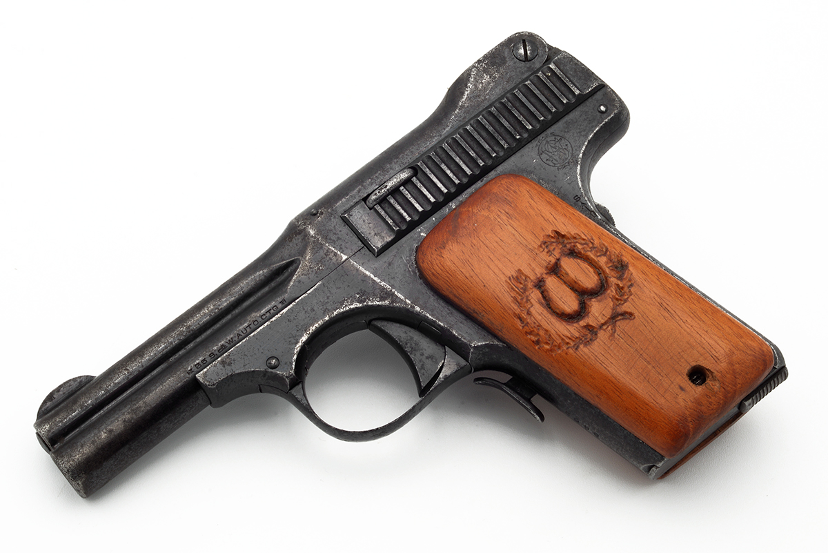 This is a Smith & Wesson Model 1913 pistol chambered in 35 S&W. It features a 3.5-inch barrel, hinged barrel assembly for easy cleanin,g and a very light bolt with a mainspring disconnector, so the slide could be cycled without fighting a heavy recoil spring. This was Smith & Wesson's very first semi-automatic handgun and used a proprietary .35 S&W cartridge with a magazine that hold seven rounds. Overall condition is fair. The bore is frosted with some light pitting and slightly worn rifling. Roughly 70% of the original bluing remains with patina and areas of light pitting and minor surface rust. The wood grips are homemade with carved Laurel leaf design around an "L" on one side and "W" on the other. Despite its condition, this is still a rare piece of Smith & Wesson history. Buy online today!