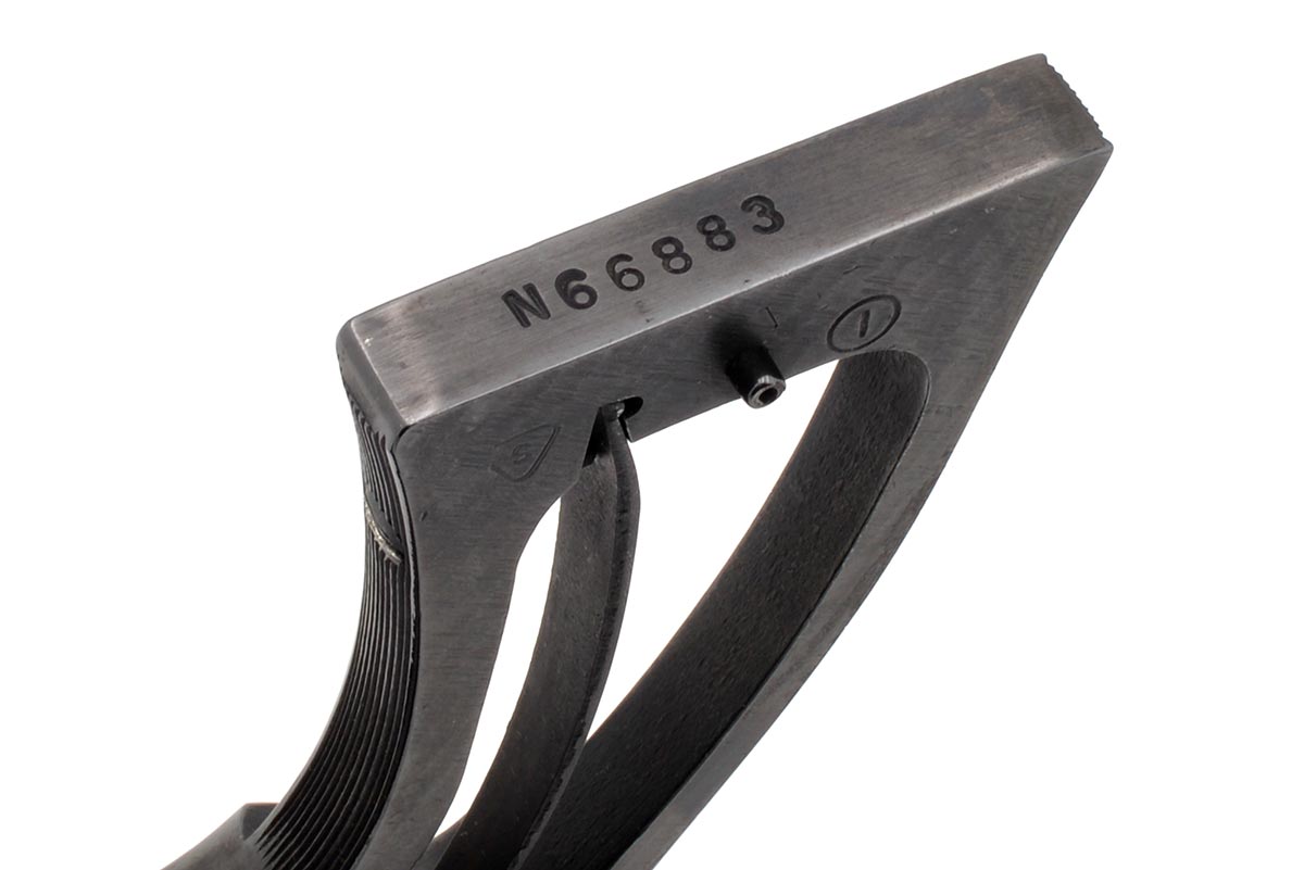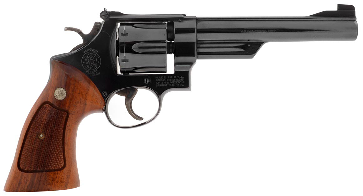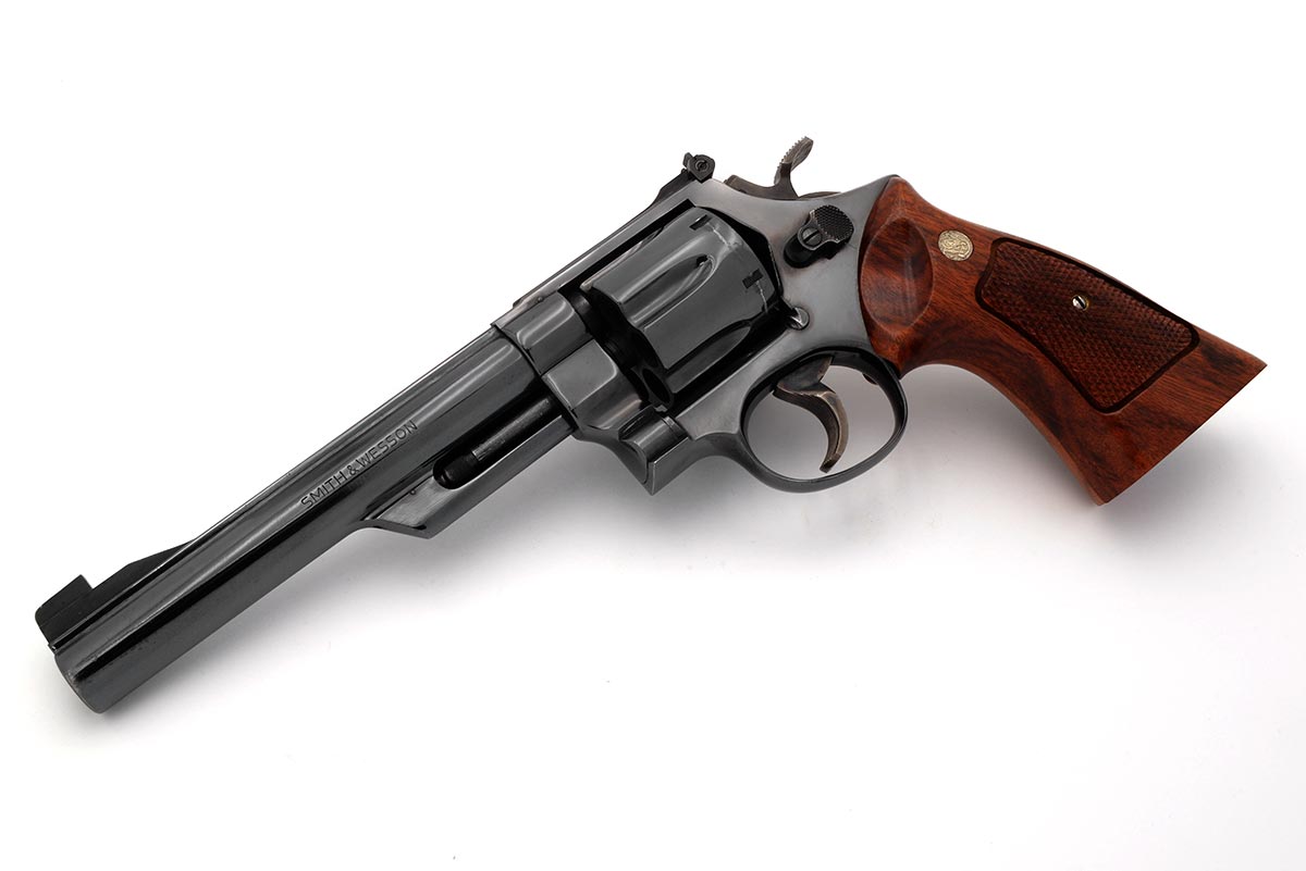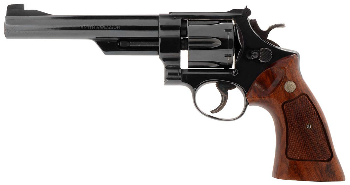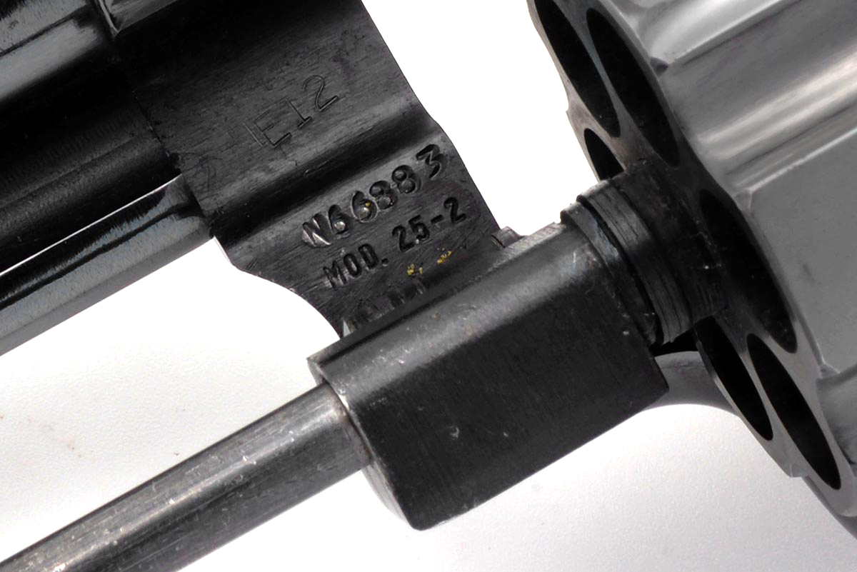 This is a Smith & Wesson Model 1955 (25-2) revolver chambered in 45 Colt and 45 ACP. It features a 6.5-inch barrel, blued finish, checkered wood target grips, target trigger, target hammer and 6-round cylinder. The serial number indicates that this revolver was manufactured in 1979. The Model 1955 25-2 is capable of shooting both 45 Colt or 45 ACP with the use of moon clips. Overall condition is good with an excellent bore, fine timing, and nice lockup. The wood grips are in near-perfect condition. There is some minor wear to the bluing around the muzzle and a prominent turn ring on the cylinder. It does appear that the side plate has been removed and it feels as though some trigger work has been done. This would make a nice addition to a S&W revolver collection or a good shooter. Buy online today!