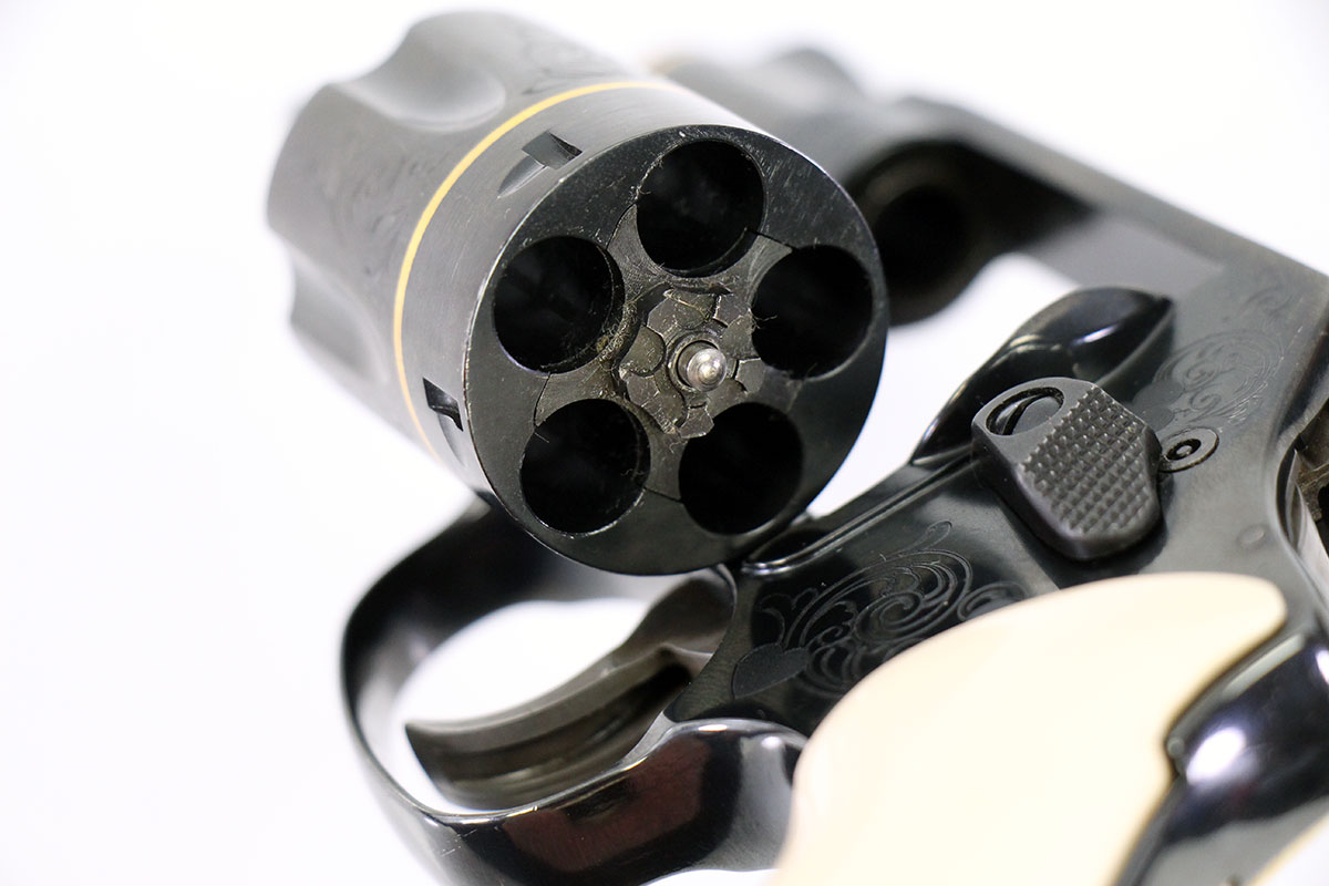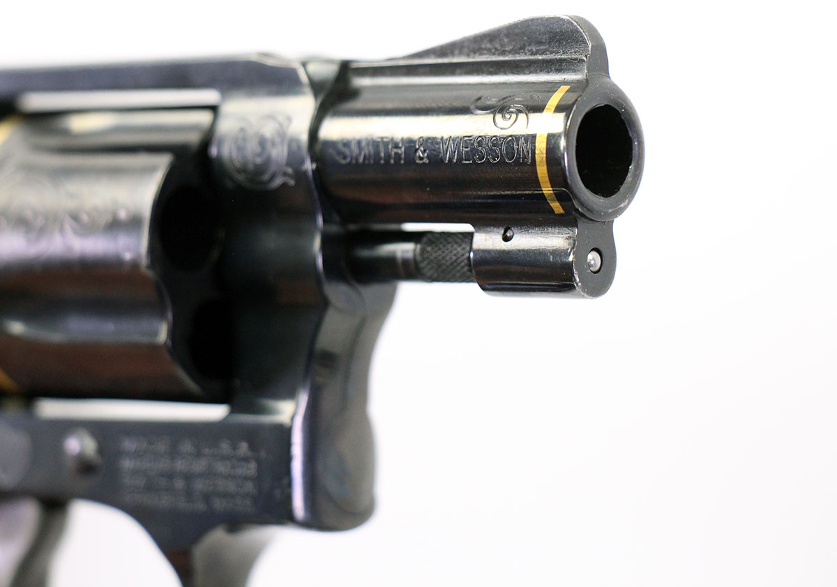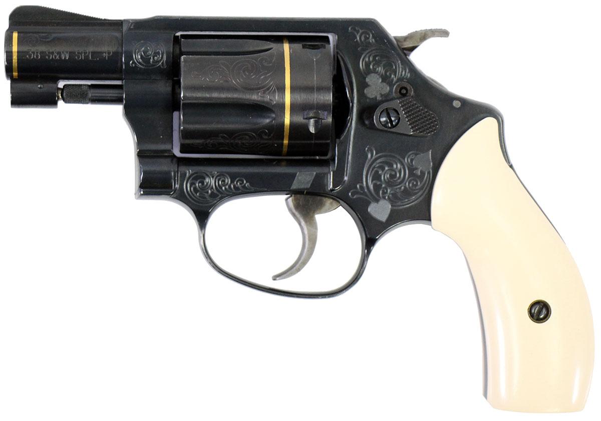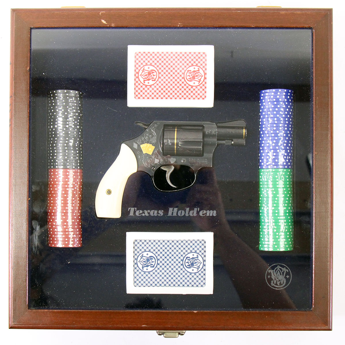 This is a used Smith & Wesson Model 36-10 Texas Hold 'Em edition revolver chambered in 38 Special. It features a 1.87-inch barrel, 5-round cylinder, fixed sights, internal lock, simulated bonded ivory grips, blued finish, gold inlay, and factory engraving. Includes factory box, spent shell casing, wooden presentation case, two decks of cards, and poker chips. This revolver was manufactured in 2005. Overall, this Smith is in good condition with normal use cylinder draglines. This would be a good choice for Smith & Wesson revolver collectors. Buy online today!