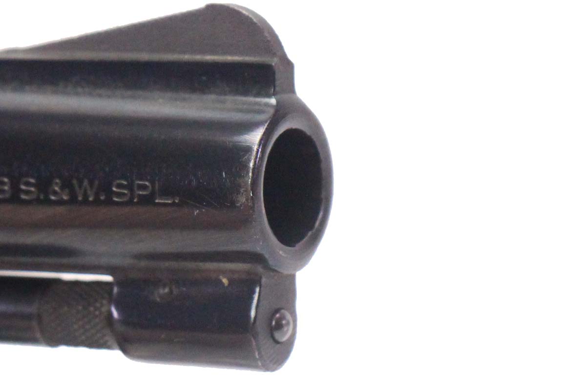 This is a classic Smith & Wesson Model 36 revolver chambered in 38 Special. It features a 1.87-inch pinned barrel, 5-round fluted cylinder, fixed sights, checkered wood grips with Smith & Wesson medallions, and early flat cylinder latch. Overall, this Smith is in good condition with some bluing wear on the cylinder and normal use turn lines. This would be a good choice for concealed carry. Buy online today!