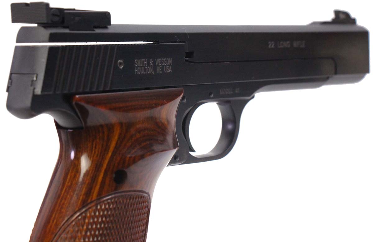 This is a used Smith & Wesson Model 41 pistol chambered in 22 Long Rifle. It features a 5.5-inch barrel, 10-round magazine, thumb safety, magazine disconnect safety, adjustable rear sight, blued finish, and wood grips. Includes factory box, manual, and five magazines. Overall, this pistol is in good condition with normal use wear on the slide and barrel. This would be a good choice for target shooting. Buy online today!