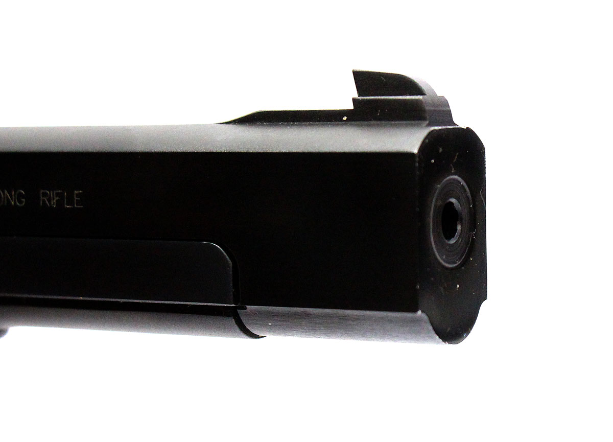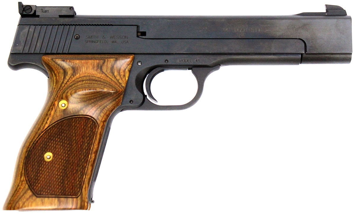 This is a used Smith & Wesson Model 41 pistol chambered in 22 Long Rifle. It features a 5.5-inch barrel, 10-round magazine, thumb safety, magazine disconnect safety, adjustable rear sight, blued finish, and wood grips. Includes factory box, manual, and two magazines. Overall, this pistol is in good condition with normal use wear on the slide and barrel. This would be a good choice for target shooting. Buy online today!