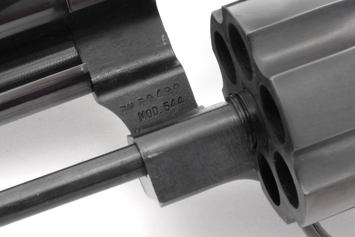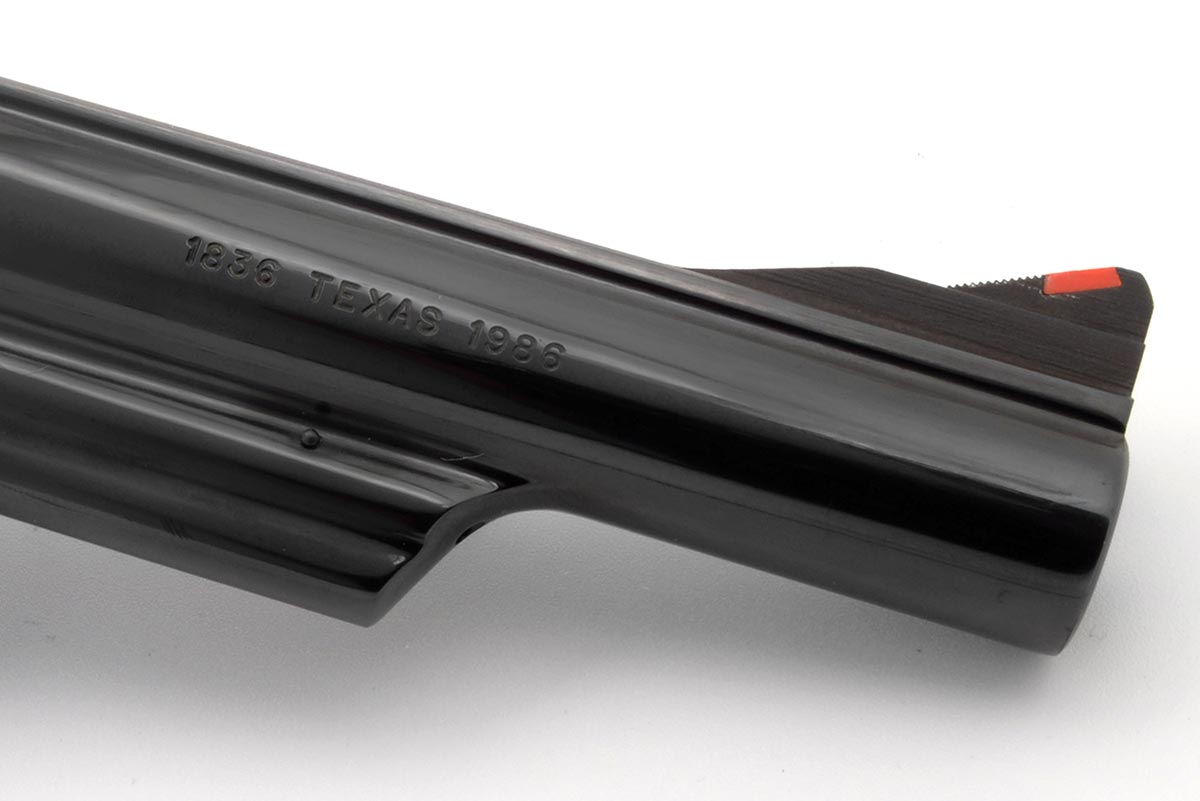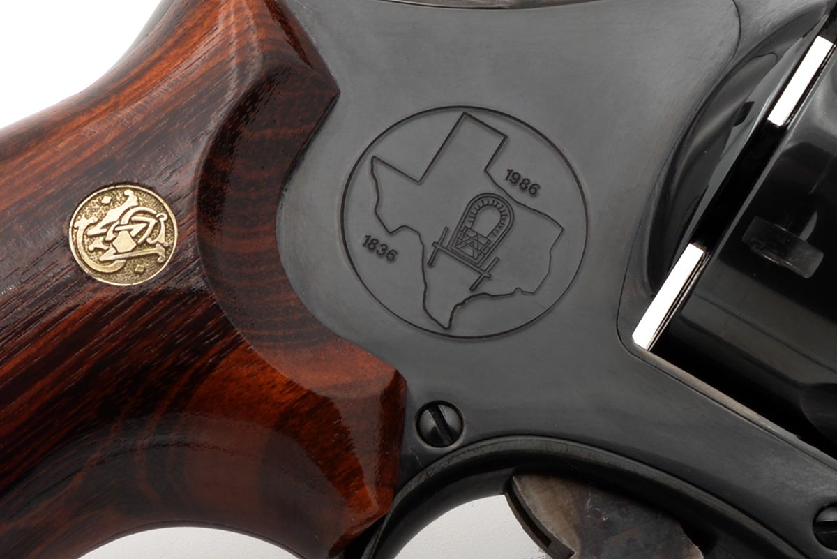 This is a pre-owned Smith & Wesson Model 544 Texas Wagon Train Commemorative 1836 - 1986 revolver chambered in 44-40 Winchester. It features a 5-inch barrel, blued finish, N Target 3-screw frame, target trigger, and target hammer. The right side of the frame is engraved with an image of Texas with a wagon with the dates 1836 and 1986. The barrel is also marked "1836 TEXAS 1986". The Model 544 was manufactured to commemorate Texas's sesquicentennial and a total of 4,782 of these revolvers were released in 1986. The Model 544 was the only Smith & Wesson revolver manufactured in 44-40 Win since 1940. Overall condition is very good with no wear to the bluing and only a faint turn ring. The bore is excellent, timing is fine, and lockup is strong. The wood grips are in great shape with a few light scuffs and scratches. The original wood display box is not included. This would make a great addition to a Smith & Wesson revolver collection or for those who collect commemorative firearms. Buy online today!