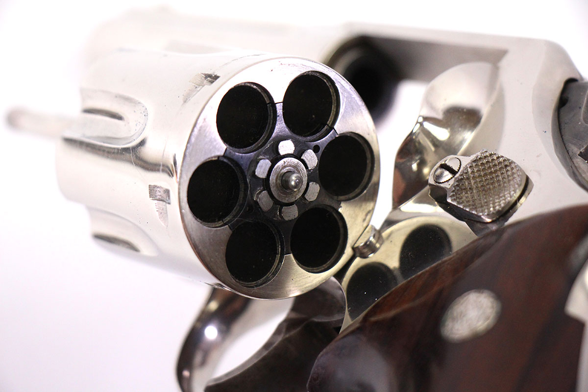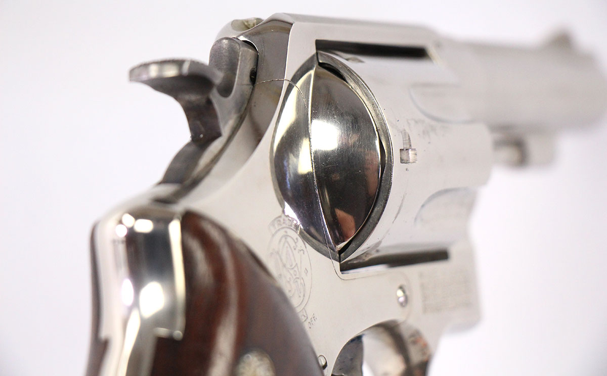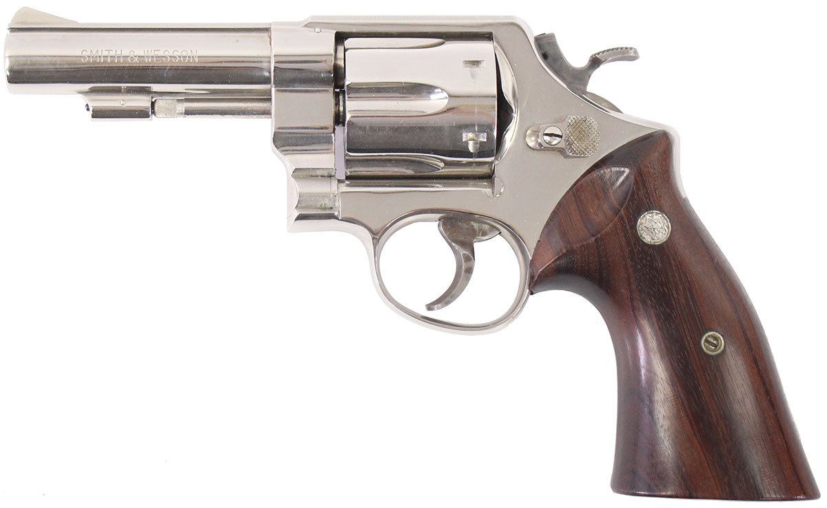 This is a used Smith & Wesson Model 58 revolver chambered in 41 Magnum. It features a 4-inch pinned barrel, 6-round cylinder, notched rear sight, serrated front sight, nickel finish, and wood grips with Smith & Wesson medallions. Overall, this Smith is in good condition with normal use cylinder draglines. This would be a good choice for home defense. Buy online today!