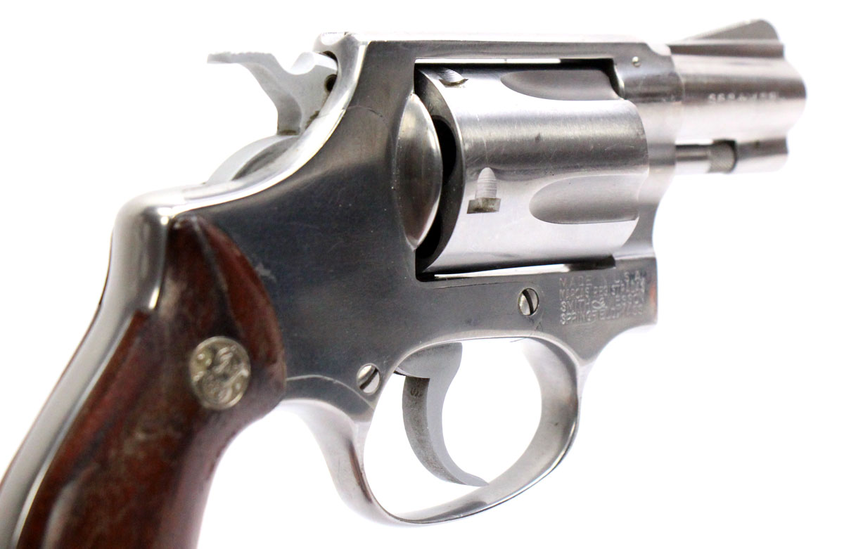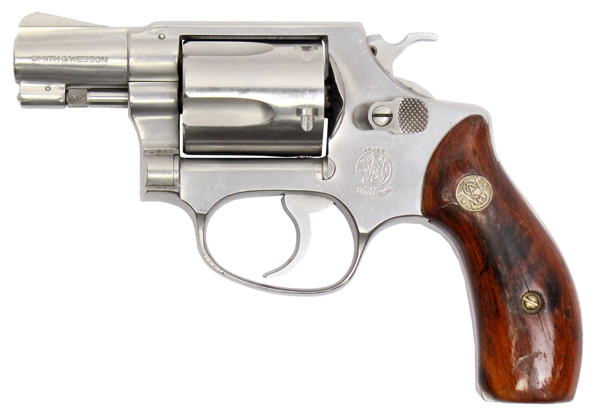 This is a used Smith & Wesson Model 60 revolver chambered in 38 Special. It features a 1.87-inch pinned barrel, 5-round cylinder, fixed sights, stainless finish, no internal lock, and wood grips with Smith & Wesson medallions. Overall, this Smith is in good condition with normal cylinder turn lines. The grips have significant wear. This would be a good choice for concealed carry. Buy online today!