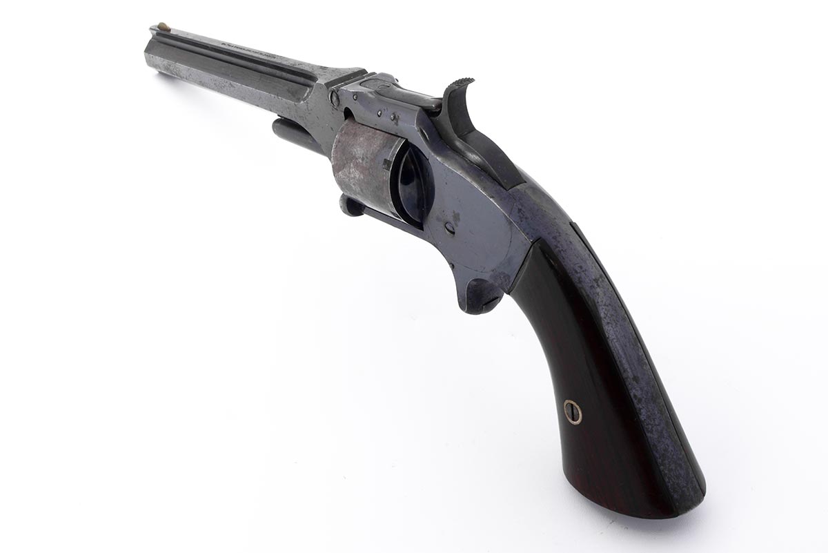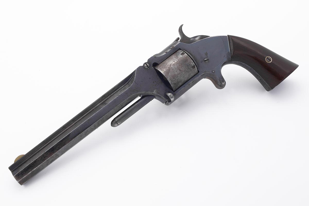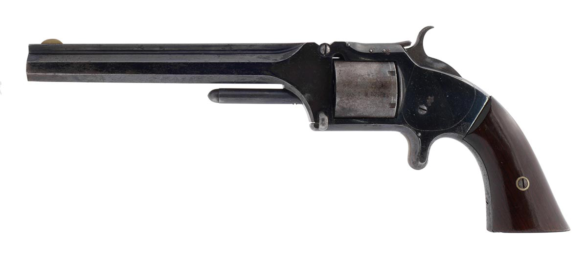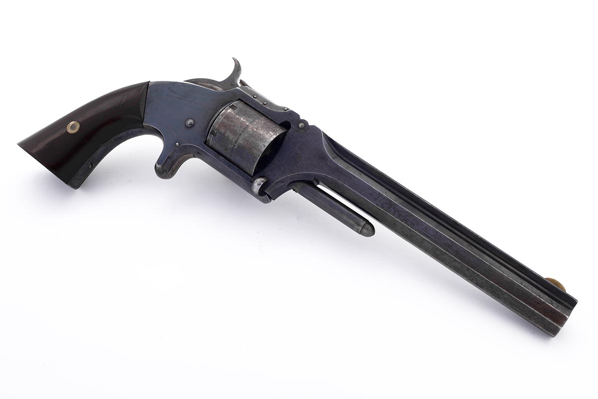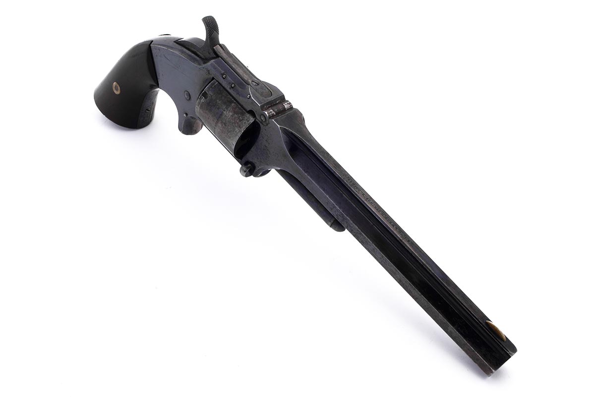 This is a US Civil War-era Smith & Wesson Model No. 2 Army revolver hambered in .32 Rimfire. It features a 6-inch barrel with top-break design, blued finish, all matching numbers and a 6-round cylinder. The serial number places the date of manufacture to 1864. Smith began shipping these type of revolvers just two months after the beginning of the American Civil War. The company continued to leverage its patent well beyond the war and these guns remained popular on the frontiers. There were 77,200 of these revolvers made from 1861 through 1874. Revolvers with serial numbers under 35,731 are considered to be Civil War guns since they were manufactured before May 1, 1865. During the Civil War, Kentucky purchased 700 of these revolvers from the arms dealer B. Kittredge & Company and issued them to the 7th Regiment Kentucky Volunteer Cavalry. Notables who carried the Model 2 Army during the war include George Armstrong Custer, who had a pair of Model 2 Army revolvers. Rutherford B. Hayes, future U.S. President, was also know to carry one. Post-war it was the preferred revolver for "Wild Bill" Hickok; he was carrying a Model 2 Army the night he was shot and killed in 1874. This example is in very good condition for being 162 years old. Much of the original bright bluing remains with very modest patina and spots of surface rust. The bore is bright and shiny with strong rifling, there are a few areas of light pitting. Mechanically everything works well with a strong hammer spring, fine timing and good lockup. This would be a great addition to any Civil War, Smith & Wesson or antique revolver collection. Buy online today!
