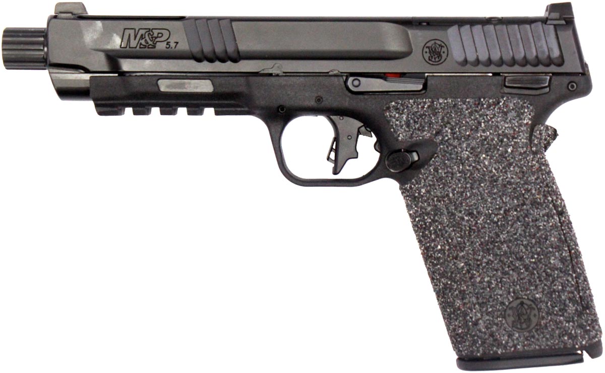 This is a used Smith & Wesson M&P 5.7 pistol chambered in 5.7x28mm. It features a 5-inch threaded barrel, 22-round magazines, 3-dot sights, optics ready slide, ambidextrous thumb safety, grip tape, and accessory rail. Includes factory box and two magazines. Overall, this Smith is in good condition with normal wear on the slide and barrel. This would be a good choice for target shooting. Buy online today!