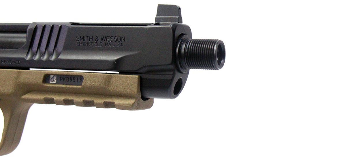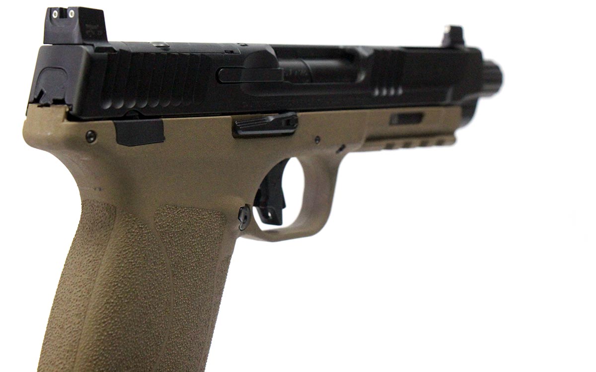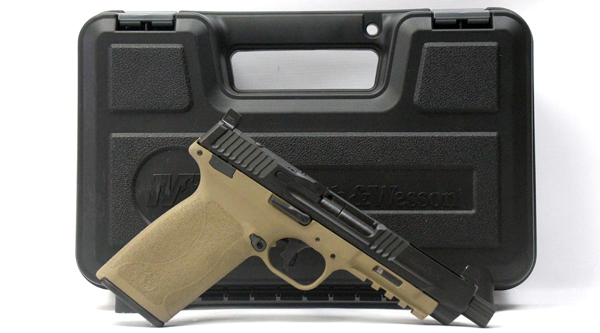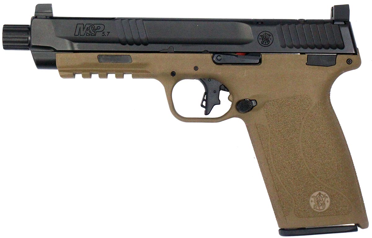 This is a used Smith & Wesson M&P 5.7 pistol chambered in 5.7x28mm. It features a 5-inch threaded barrel, 22-round magazines, Trijicon suppressor-height night sights, flat dark earth frame, and accessory rail. Includes factory box, three magazines, magazine loading tool, and instruction manual. Overall, this Smith is in very good condition with minimal wear. This would be a great choice for target shooting. Buy online today!