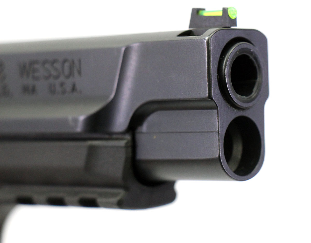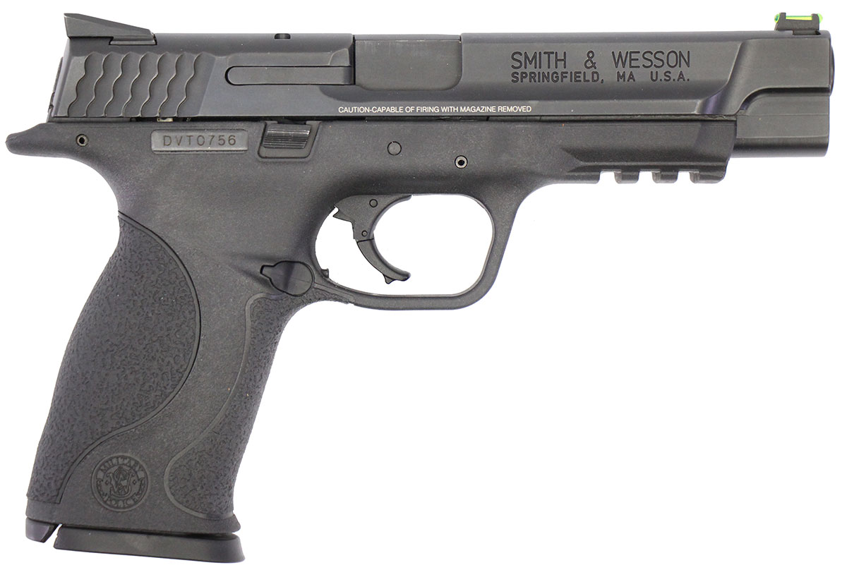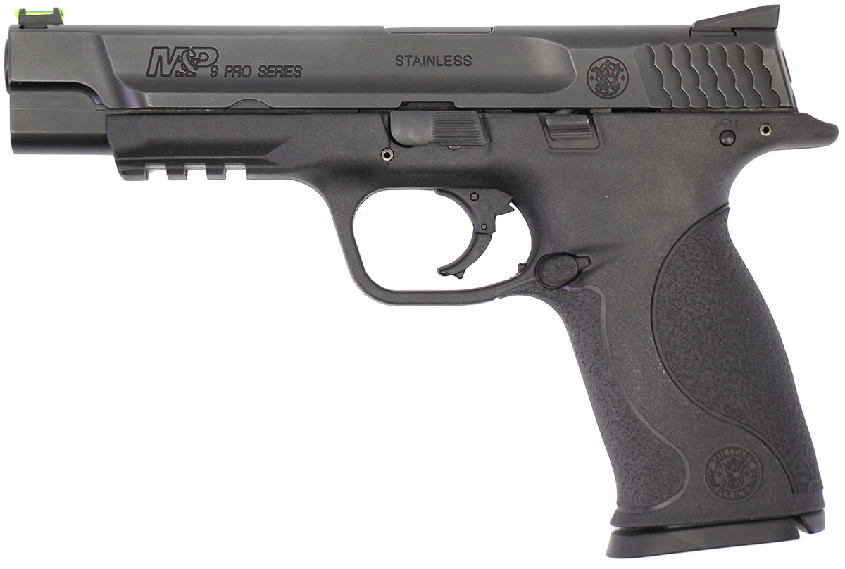 This is a used Smith & Wesson M&P 9 Pro pistol chambered in 9mm. It features a 5-inch barrel, 17-round magazine, fixed rear sight, fiber optic front sight, and accessory rail. Overall, this Smith is in good condition with normal use wear on the slide and barrel. This would be a good choice for target shooting. Buy online today!
