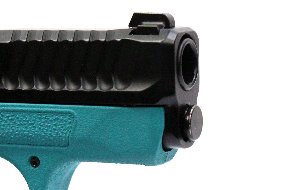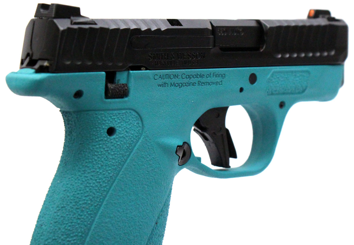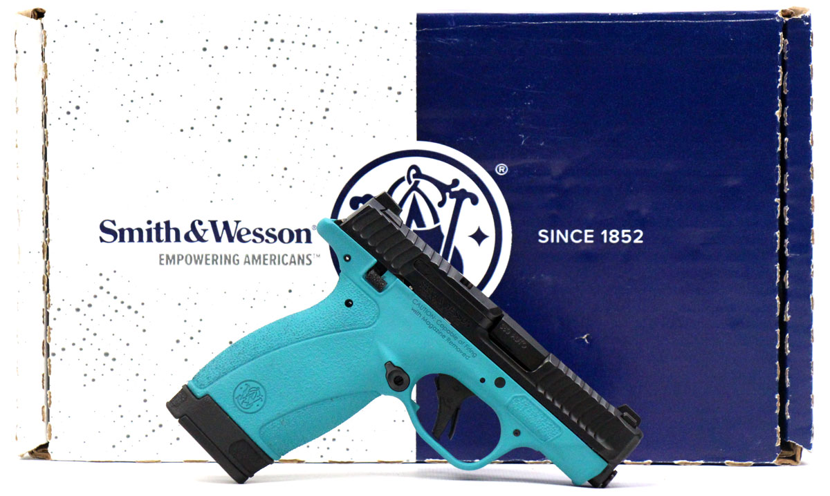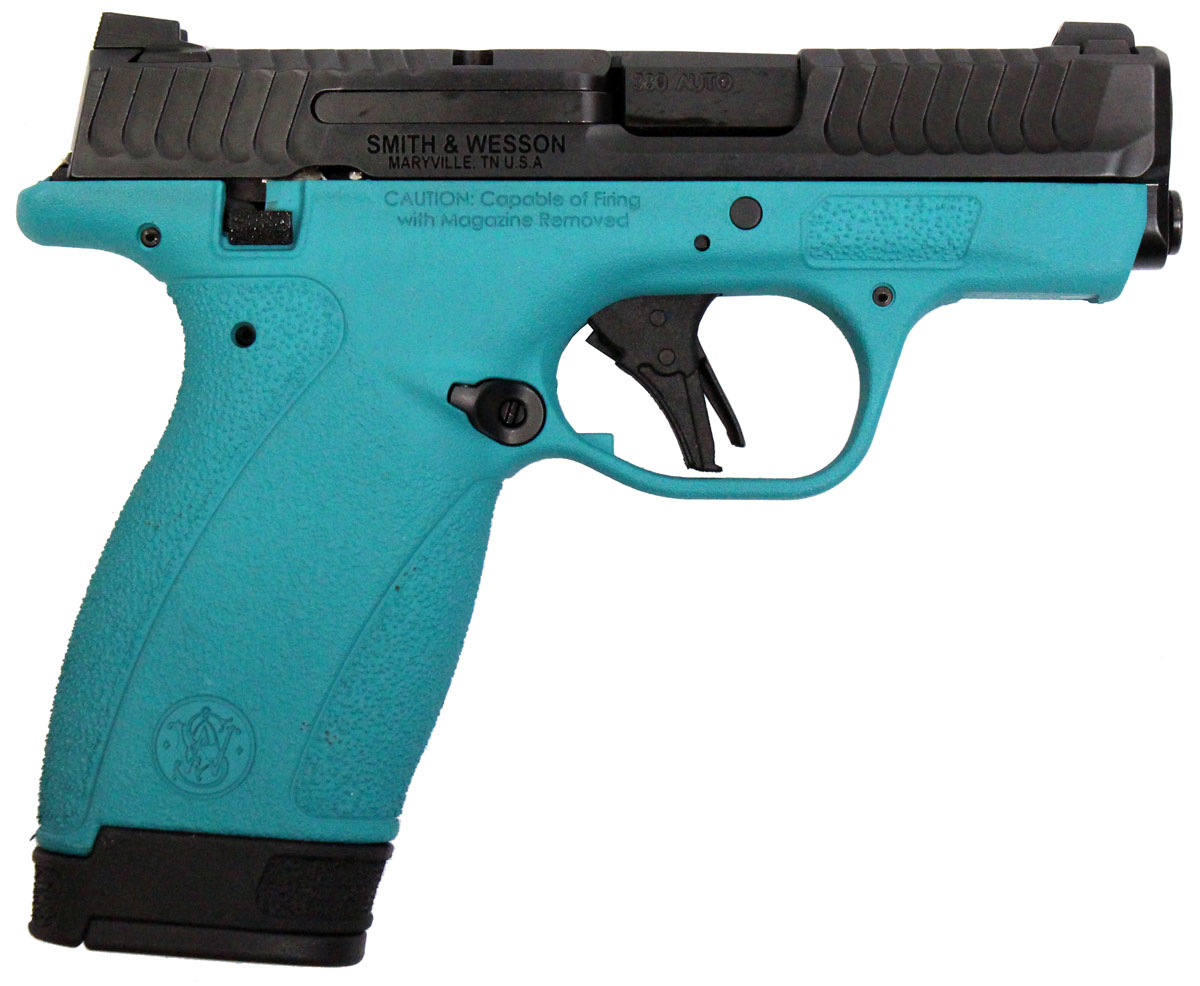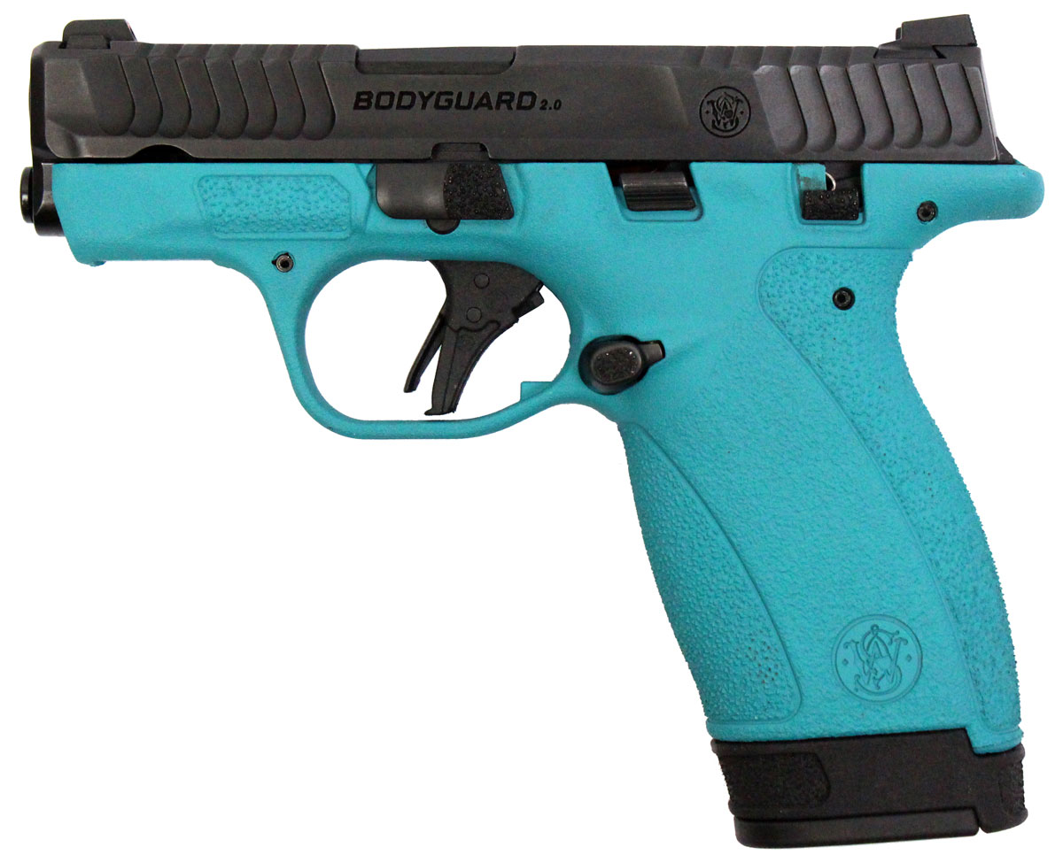This is a used Smith & Wesson M&P Bodyguard 2.0 pistol chambered in 380 ACP. It features a 2.75-inch barrel, 12-round magazine, Tiffany blue Cerakote finish, tritium front sight, thumb safety, and fixed rear sight. Includes factory box, instruction manual, one 10-round magazine, and one 12-round magazine. Overall, this Smith is in very good condition with minimal wear. This would be a great choice for concealed carry. Buy online today!