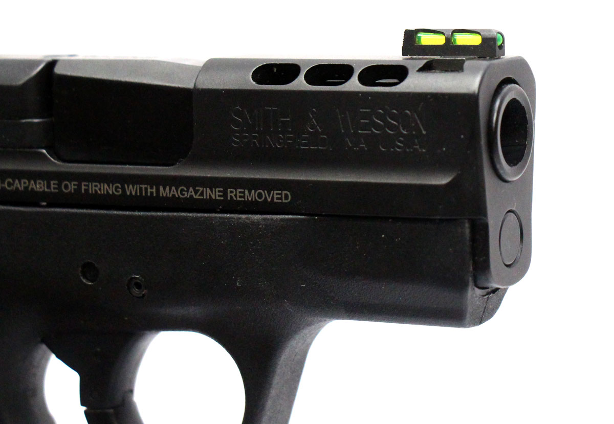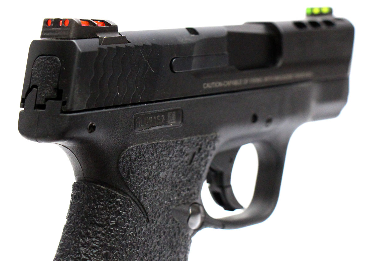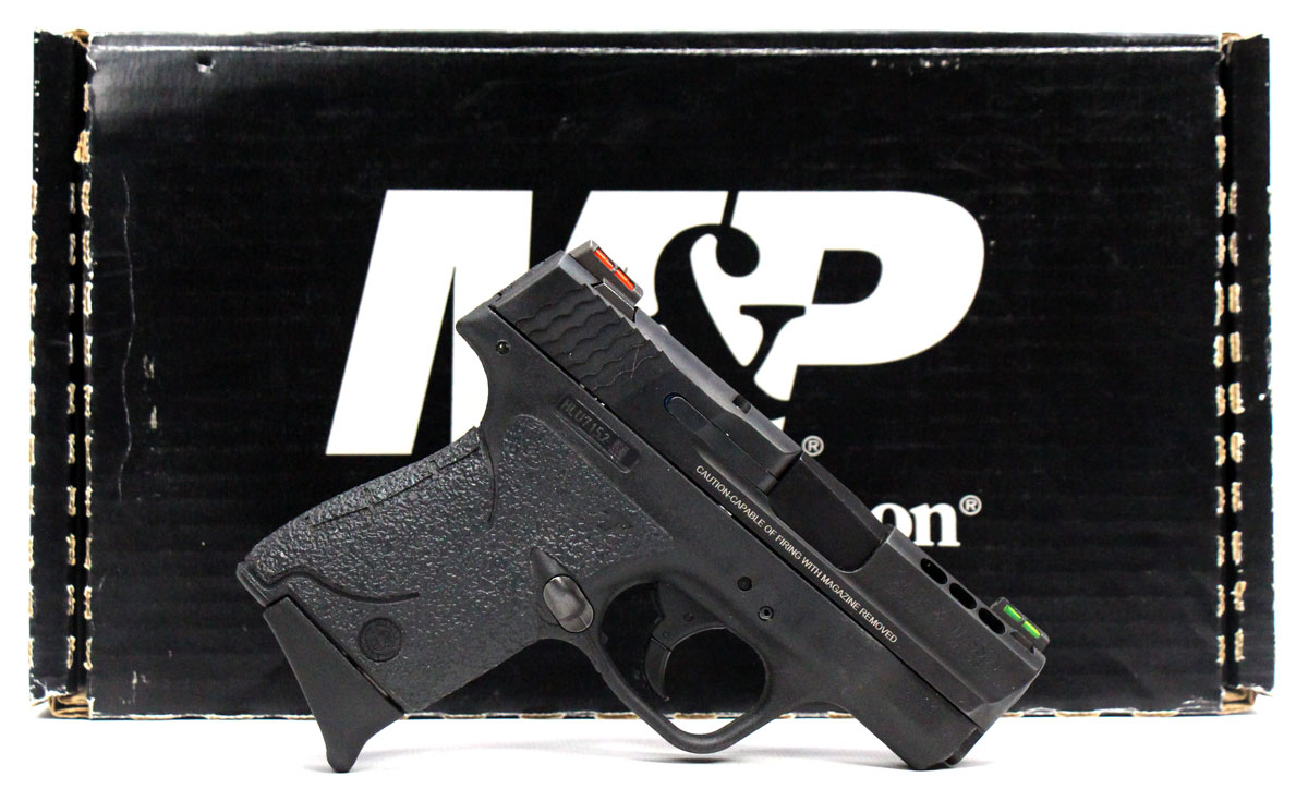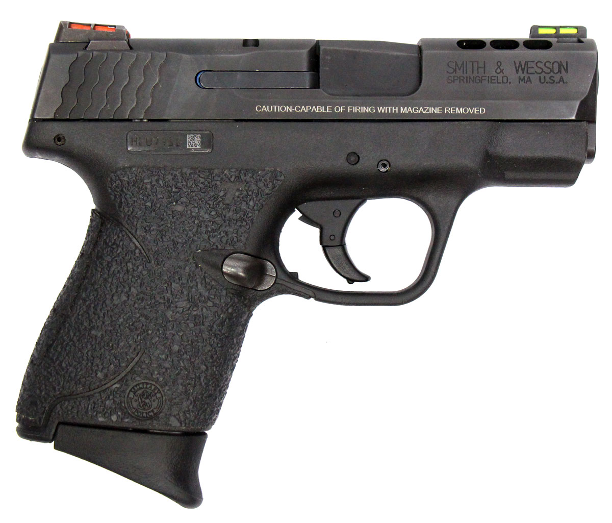 This is a used Smith & Wesson Performance Center M&P Shield pistol chambered in 40 Smith & Wesson. It features a 3-inch ported barrel, 6-round magazine, fiber optic sights, grip tape, and manual safety. Includes factory box, manual, one 6-round magazine and one 7-round magazine. Overall, this Smith is in good condition with normal use wear on the slide and barrel. This would be a good choice for concealed carry. Buy online today!