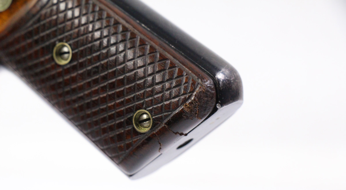 This is a collectible Smith & Wesson Straight Line pistol chambered in 22 Long Rifle. It features a 10-inch barrel, single shot side swiveling action, adjustable rear sight, checkered wood grips, and blued finish. Includes factory box and cleaning rod. Overall, this pistol is in good condition with some bluing wear toward the muzzle and on the frame. The right side grip panel is cracked toward the bottom screw. Bore condition is good with crisp rifling. Approximately 1,873 of these pistols were manufactured between 1925-1936. This gun is serial number 62. This would be a great choice for classic pistol collectors. Buy online today!