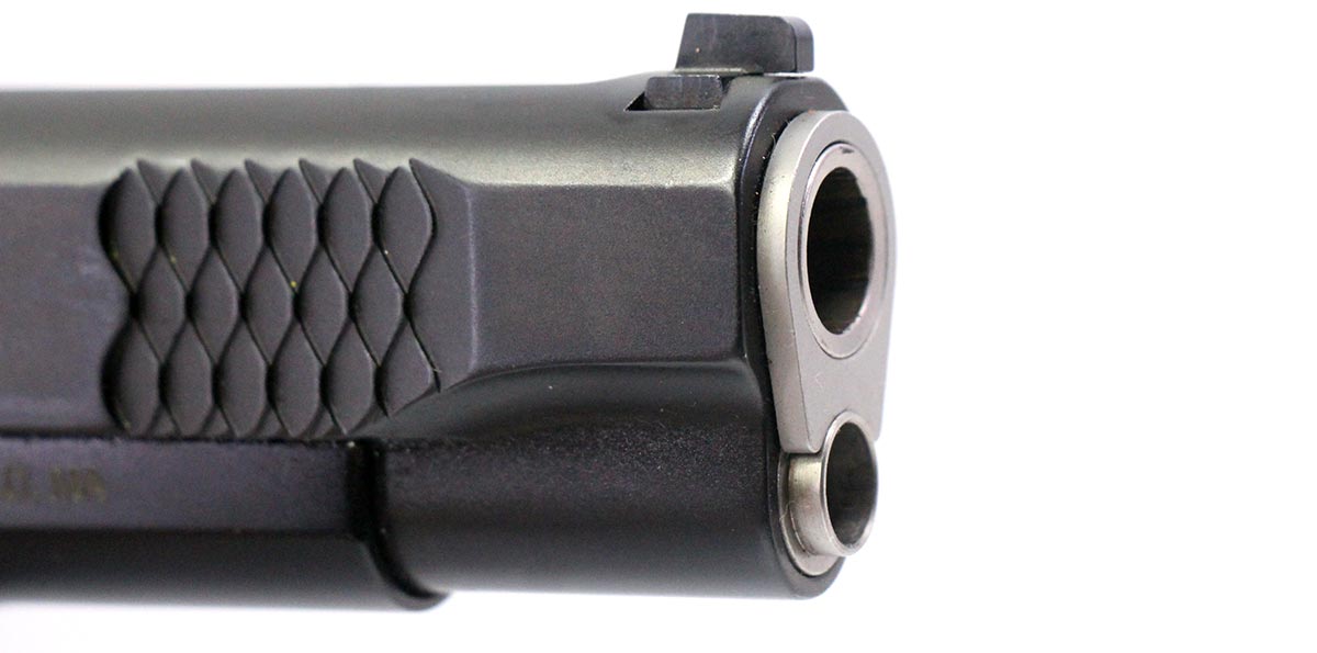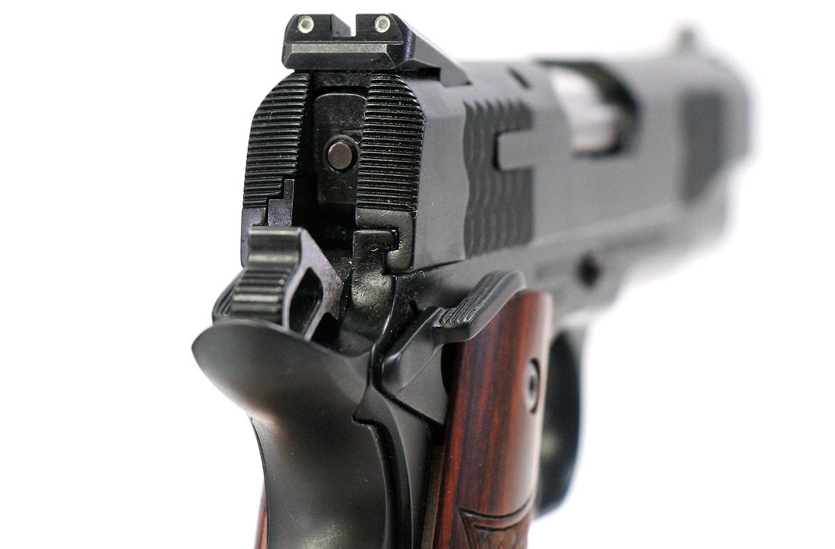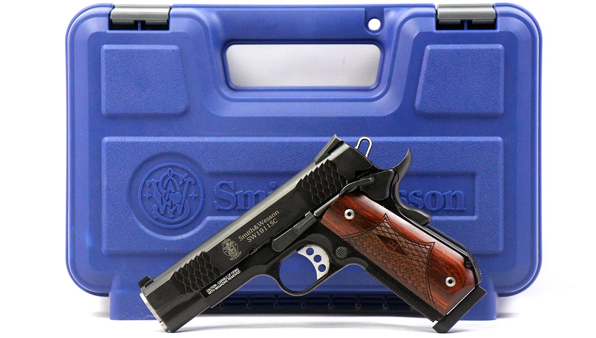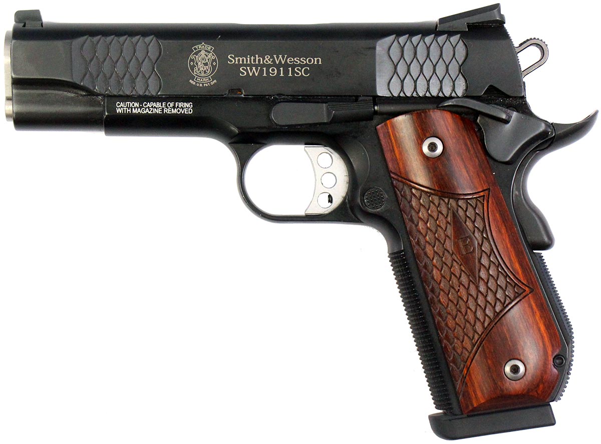 This is a used Smith & Wesson SW1911 E Series pistol chambered in 45 ACP. It features a 4.25-inch barrel, 8-round magazines, night sights, thumb safety, grip safety, and wood grips. Includes factory box, manual, one 7-round magazine, and two 8-round magazines. Overall, this pistol is in good condition with normal use wear on the barrel, slide, and frame. This would be a good choice for home defense. Buy online today!