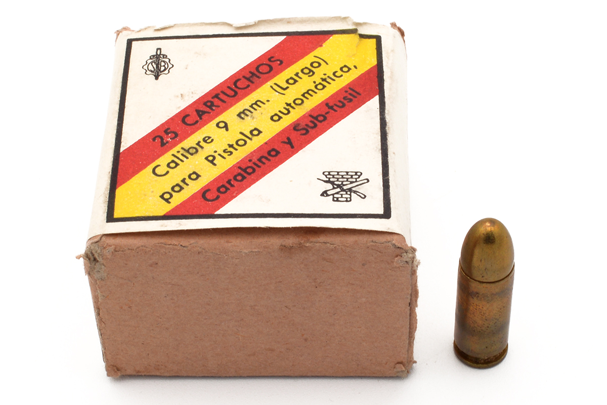 This is a box of Spanish surplus 9mm Largo (9x23mm) ammo. It features 127 grain FMJ bullets, brass metallic cartridges and Spanish military proof marks on the box. Overall this ammo is in good surplus condition with minimal signs of corrosion. This would be a good choice for surplus or military collectors.