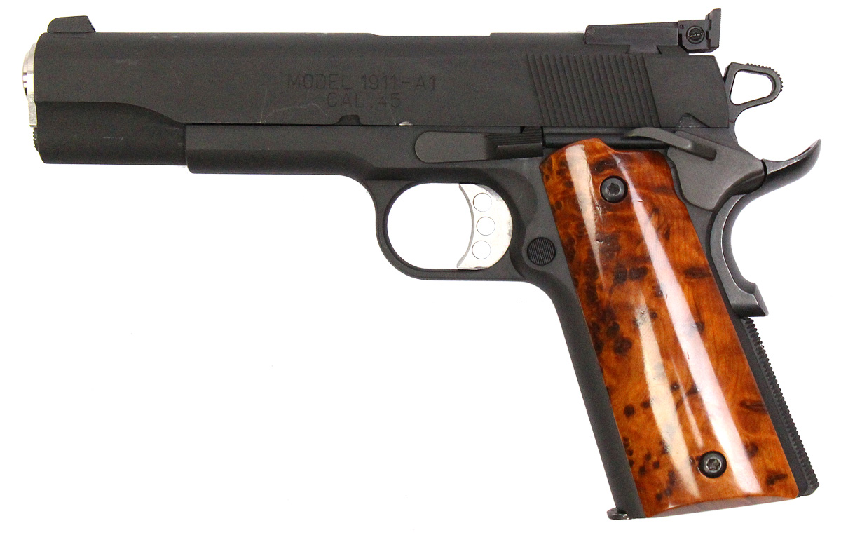 This is a used Springfield 1911-A1 Range Officer pistol chambered in 45 ACP. It features a 5-inch barrel, 7-round magazine, adjustable rear sight, thumb safety, grip safety, and wood grips. Overall, this Springfield is in good condition with normal use wear on the barrel, slide, and frame. This would be a good choice for target shooting. Buy online today!