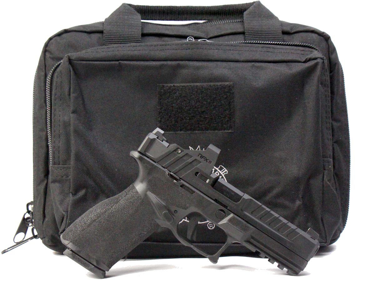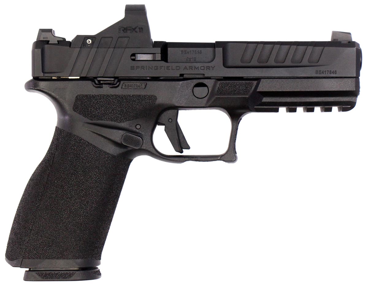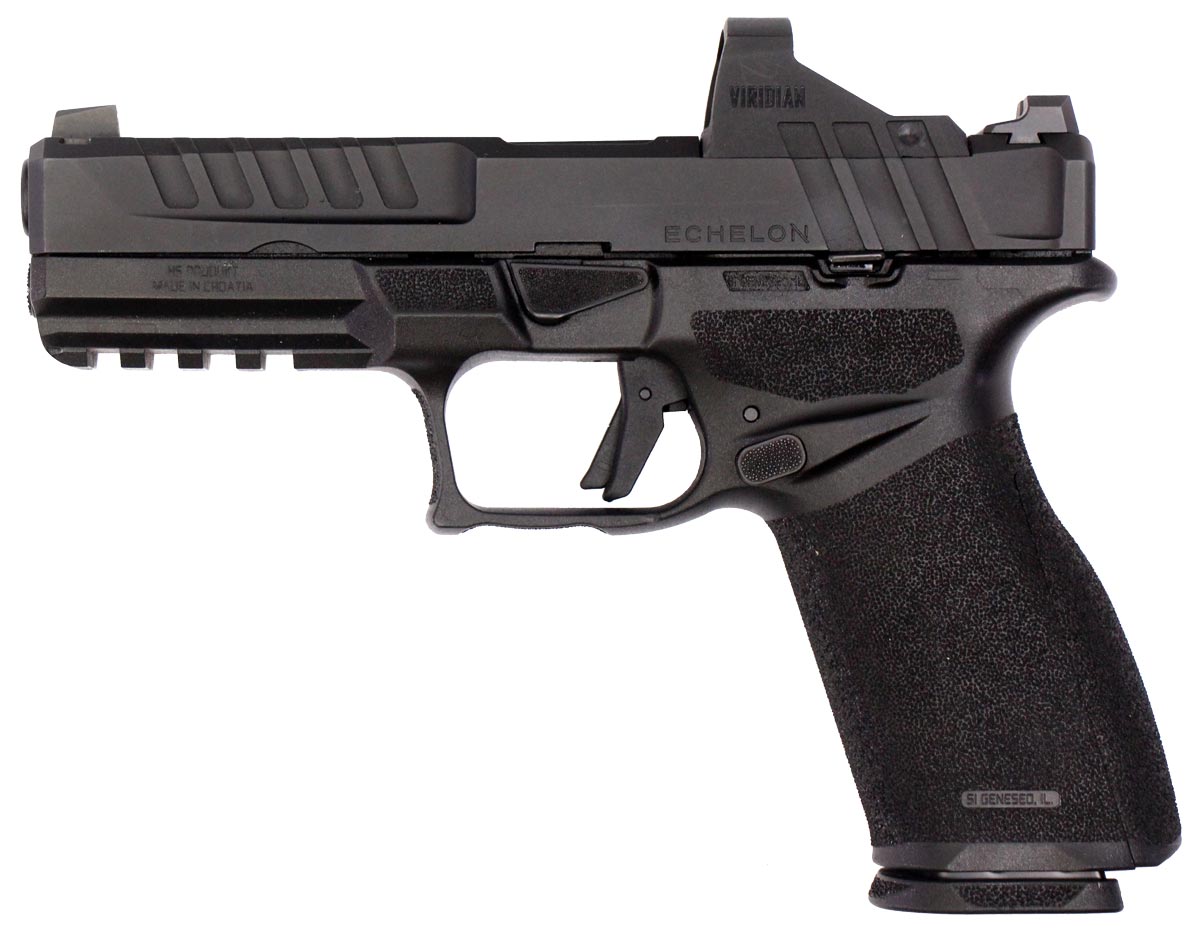This is a used Springfield Armory Echelon pistol chambered in 9mm. It features a 4.5-inch barrel, 17-round magazines, night sights, Viridian RFX11 green dot sight, and accessory rail. Includes nylon case, two 17-round magazines, and one 20-round magazine. Overall, this Springfield is in good condition with normal wear on the slide and barrel. This would be a good choice for home defense. Buy online today!