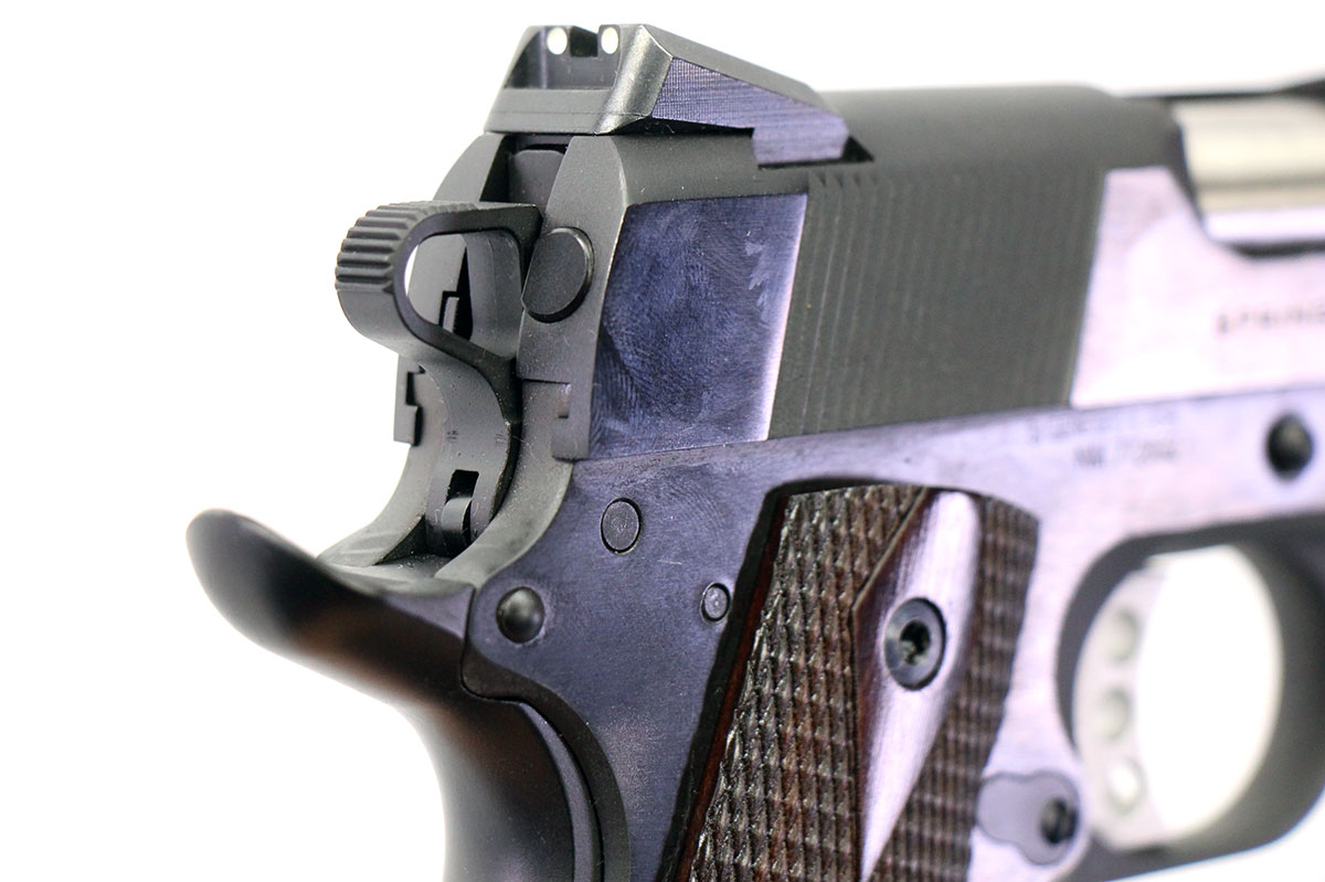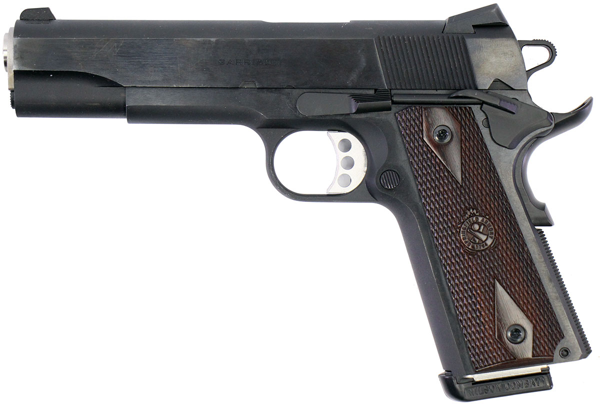 This is a used Springfield Armory Garrison 1911 pistol chambered in 45 ACP. It features a 5-inch barrel, 8-round Wilson Combat magazine, thumb safety, grip safety, fixed sights, wood grips, and blued finish. Overall, this Springfield is in good condition with normal use wear on the slide and barrel. This would be a great choice for home defense. Buy online today!